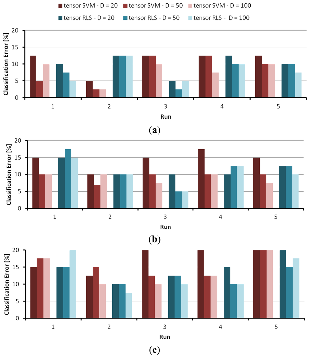 Although a specific value of σ and α parameters can be set for each factor kernel kz, the present research adopts one σ value and one α value for every kz. The role of the latter parameter is crucial because α is the only quantity that is not included in the configuration of a conventional kernel machine. As anticipated above, a conventional choice for this parameter is α = Qz∀z ∈ {1, …, Z}. On the other hand, one should also consider that SVD can effectively take out redundancy or noise from data, and this property may prove appealing in the pattern-recognition application at hand. Thus, by fine tuning α one can expect to decrease the quantity of noise that affects the tensor patterns (or, more precisely, the unfolding of the tensors themselves), and in turn boost the generalization ability. As a result, in the present research the α quantity is treated as a configurable parameter whose value can vary between 1 and Qz.