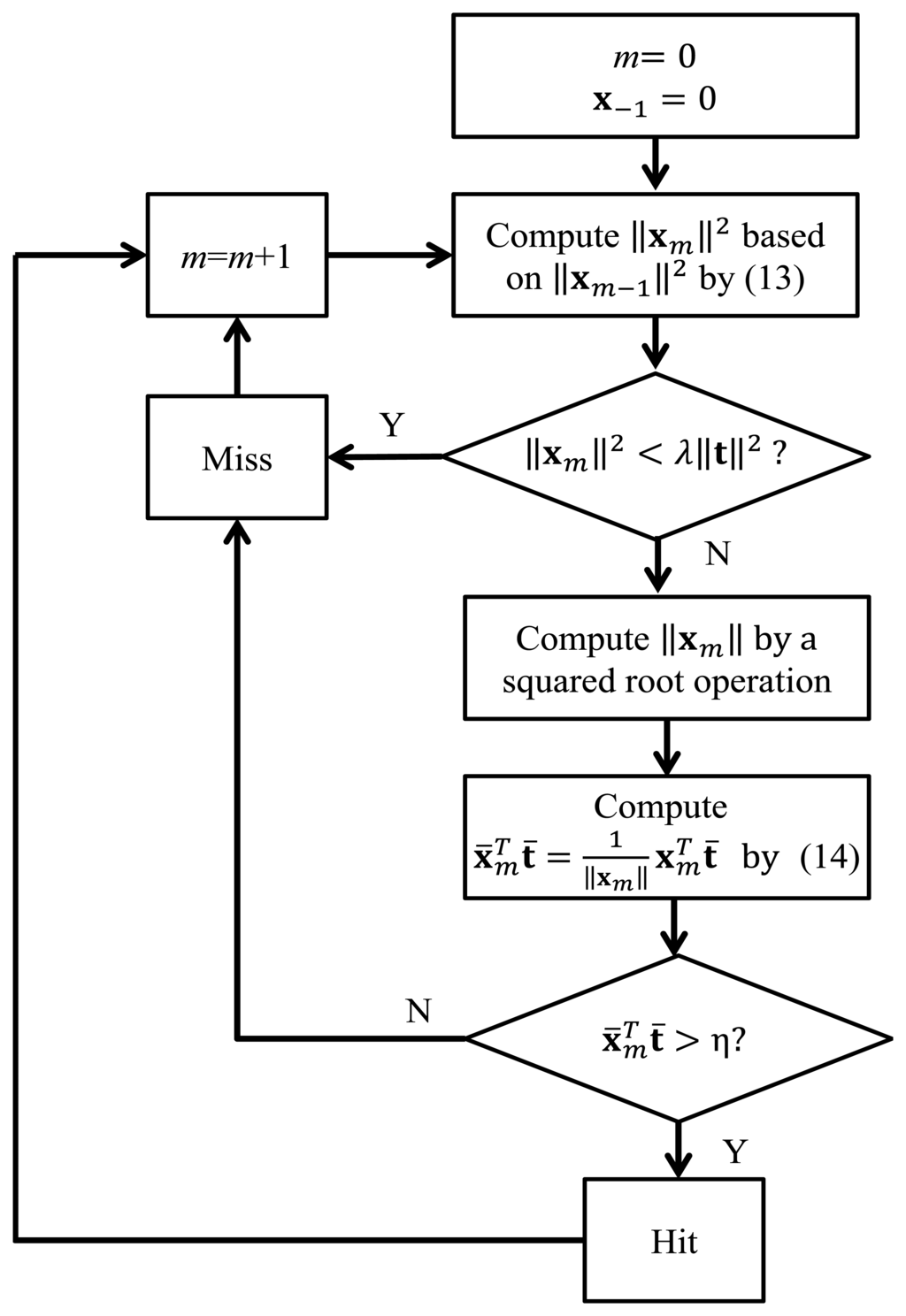 We can also see from Table 1 that the computational complexities of the fast normalized correlator implementation are only slightly higher than those of the matched filter without normalization. The computational complexities of the fast implementation can be further reduced by performing an energy-based pre-screening operation before the correlation computation. The pre-screening operation compares the energy ‖xm‖2 with ‖t‖2. If ‖xm‖2 < λ‖t‖2, where 0 < λ < 1, then ‖xm‖2 may not be a spike, due to small energy. This may effectively reduce the number of correlation computations. By further incorporating the energy-based pre-screening operation, the proposed fast normalized correlator may have a computational time lower than that of the basic matched filter without normalization. Let p (0 < p < 1) be the probability that ‖xm‖2 < λ‖t‖2 is true. As shown in Table 1, the average number of additions, multiplications and divisions are p(N − 1) + 2, pN + 2 and p, respectively. A flowchart detailing the operations of the fast normalized correlation computation with post-correlation normalization and energy-based pre-screening is shown in Figure 1.