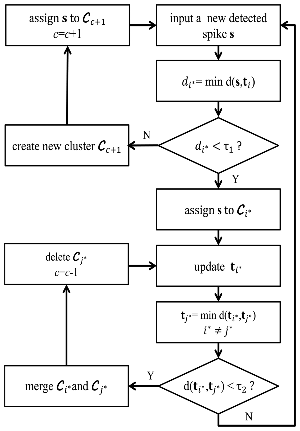 At the initial stage of the system, no templates are available for spike detection. Therefore, at this stage, the noncoherent block energy detector based on Equation (5) is adopted for detection. The threshold η in the initial stage is automatically determined by Equations (6) and (7). The detected spikes are then processed immediately by the OSort algorithm for classification and template generation. After a time interval of T1 seconds, the cluster centers ti, i = 1, …, c, produced by OSort are used as templates for the subsequent spike detection.