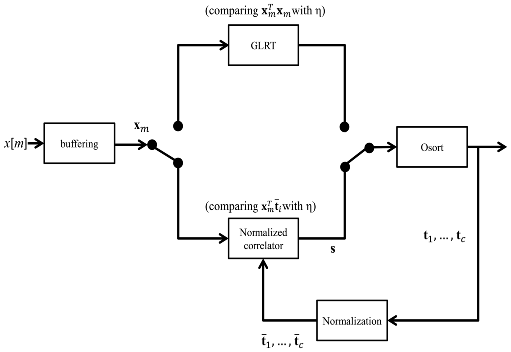 A drawback of the matched filter or LRT is that the proper selection of a threshold value η may be challenging. From Equation (3), we see that, without the prior knowledge of P(H0), P(H1) and σ2, the computation of optimal η may be difficult. An alternative approach for the threshold selection is to determine the η value from an upper bound of a mismatch measurement for template matching. An input block with the mismatch measurement below the upper bound is declared as a hit, where the upper bound can be pre-specified. A correlator designed in this way can be linked to the simple pattern matching techniques based solely on the squared distance measures.