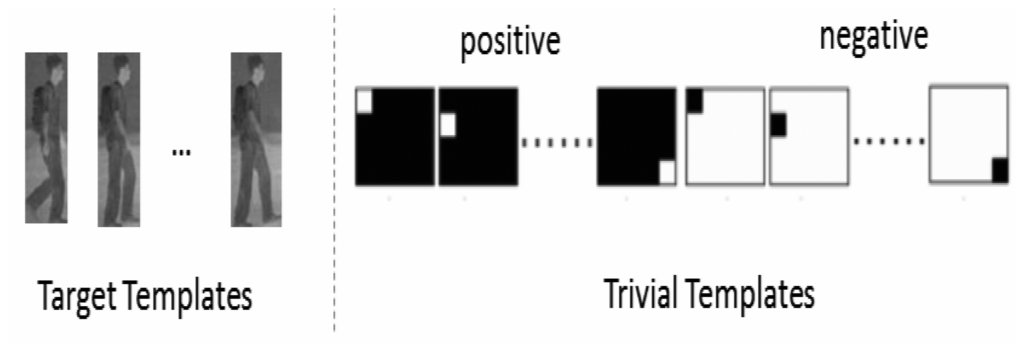 The fundamental assumption for appearance-based object tracking is that the global appearance of an object, despite varying illumination and viewpoint conditions, is still characterized by a low-dimensional space. Under the context of appearance-based object tracking, dictionary A is decomposed of target templates (image patches in Rm), as well as a collection of trivial templates (to model occlusion and noise in the real-world observation data), as shown in Figure 1. If one writes A as: