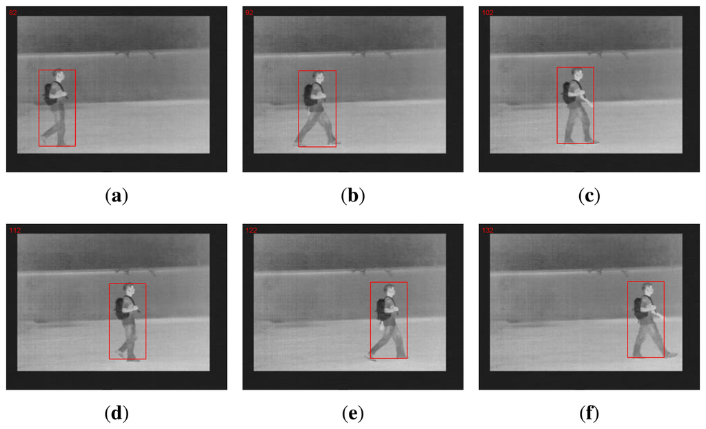 We first demonstrate the tracking result for single-object tracking. Figure 2 shows a collection of sample frames obtained from one typical FLIR video of CASIA Dataset C by l1-based tracking. Since the background is relatively simple and only one pedestrian is present, the tracking is not a challenging issue for this data set. The new insight supplied by this experiment lies in that l1-based tracking offers an automatic and robust cropping tool to obtain matching templates; i.e., the elements of dictionary A. Note that the length of even a short video segment is a few seconds, which implies that at least dozens (or even hundreds) of matching templates can be cropped from the video clip. We note that this fact suggests that there is a significant amount of temporal redundancy that can be exploited by the recognition component.