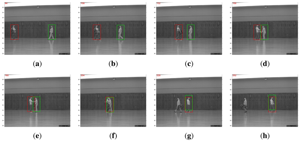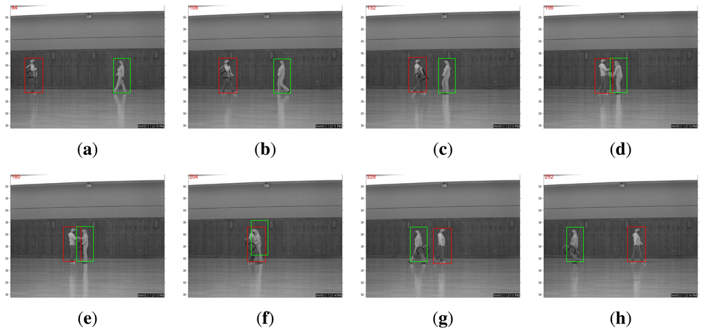 A more interesting comparison result is in the scenario of multi-object tracking. For example, the WVU dataset contains test sequences in which two person walk toward each other. When the two pedestrians meet, one hands the bag to the other, and then, they continue walking away from each other. Such a protocol dictates that occlusion is present for a relatively long period of time. As shown in Figure 3, the straightforward application of the l1-based tracking algorithm in [11] expectedly fails at the occlusion. The algorithm will be confused by the overlap of target templates associated with two pedestrians. By contrast, a recognition-based, nonlocal, template-updating strategy proposed in the previous section can produce robust and accurate tracking, even after one person hands the bag to the other (note that there are significant variations in terms of appearance), as shown in Figure 4. This is because when occlusion occurs, the recognition-based strategy will update the template stored from a distance past (in other words, nonlocal becomes more trustworthy than the local temporal neighborhood). Such experimental results justify the effectiveness of our tracking-by-recognition approach.