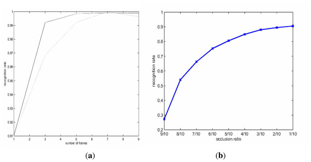 Therefore, the MAP decision boils down to a generalized minimum-distance classifier defined with respect to the group of measurement vectors. Alternatively, as suggested in [33], one can combine the decision outcomes instead of posterior probabilities, e.g., the final decision can be made by either sum rule , 1 ≤ i ≤ k or majority-vote rule Id = mode {Id1, …, Idl}, where Idj is the label returned by applying the minimum-distance classifier of Equation (8) to measurement vector xj. Even though the benefit of combining classifiers has been well-established in the literature (e.g., refer to [34]), the relationship between the number of classifiers l and performance gain is not. As we will show in the Experimental Results, even a small number of l (<10 frames) measurement vectors can dramatically boost the recognition accuracy.