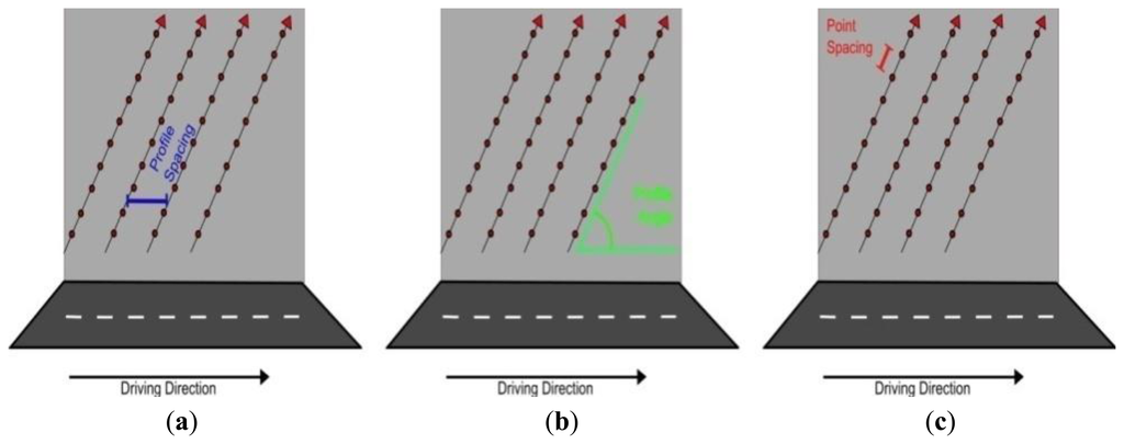 At present there are no generic, robust methods for quantifying point distribution and we believe the procedure set down in this paper will be the first example of this. Modern MMSs operate a 2D, full-circle laser scanner designed for mobile surveys. 2D scanners utilise the forward motion of the vehicle to provide 3D data (Figure 1b). When this scanning pattern intersects with a planar surface, the laser points are distributed over the surface in a linear pattern. These lines are termed, ‘scan profiles’. The gaps formed between each scan profile is the ‘profile spacing’ (Figure 2a). The angle of the scan profile on the target is influenced by the orientation of both the scanner and the target. This angle is termed the ‘profile angle’ and is illustrated in Figure 2b. The vehicle speed, the orientation of the scanner(s), the scanner mirror frequency (Mf) and the orientation of the object all influence scan profiles. The distance between subsequent points along a scan profile is known as the ‘point spacing’, as illustrated in Figure 2c. Point spacing is influenced by a number of factors, including: the pulse repetition rate (PRR), which is the number of pulses per second, Mf, which controls the number of mirror rotations per second, the range to the target from the scanner, the scanner's field of view (FOV), the height difference between target and scanner, the orientation of the target and finally the orientation of the scanner. The orientation of the scanner is important for maximising coverage of the environment and can be varied between surveys. Scan hardware settings are also variable and dependant on the smallest target in the survey specification. Accurately calculating the influence that any variation in configuration or settings has on point distribution is important for optimising MMS performance. This paper presents a novel and accurate method to do this.