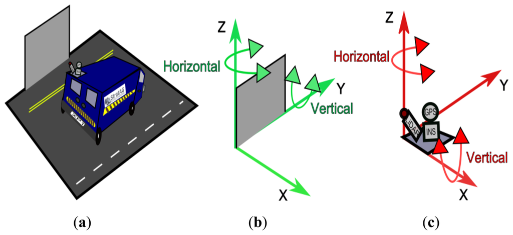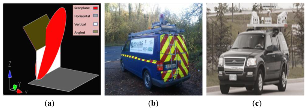 Point distribution is not only of interest to MMSs. In [17] the resolution of terrestrial laser scanner (TLS) point clouds was investigated and [18,19] have investigated the smallest feature that can be recognised in a TLS point cloud. Research like this is of benefit to TLS operators surveying fine-detail like statues or paintings, but the majority of MMSs are unsuitable for these surveys. Although it is possible to mount a TLS on a vehicle and use it in ‘stop and go’ mode, these are not suitable for mobile surveys. In ‘stop and go’ a tripod mounted scanner is placed on a moving platform and driven to a survey point [20]. The vehicle stops at this point and then scans the entire scene. The vehicle then moves to the next survey point and this process is repeated. To operate a TLS on a moving platform, the TLS must have one of its axes of rotation locked so it can operate in ‘profile mode’ [21,22]. However, due to their popularity with MMS designers, e.g., the Optech Lynx [23], Trimble MX8 [24] and StreetMapper [25], the point and profile algorithms described in this paper focus on 2D full circle scanners only. Existing work in this area calculates point distribution through three main methods: manual measurements, geometric formulae and LiDAR simulations.