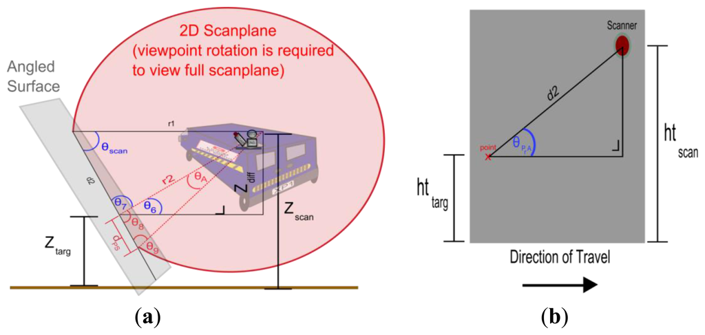 Most laser scanner manufacturers provide information on the point density that a user can expect from their hardware. Riegl [26] provide detailed graphs plotting the point density a user can expect for various scanner, target and vehicle parameters. This is useful in the mission planning stage, however, it does not incorporate scanner rotations, target rotations or any height difference between scanner and target. These graphs are also hardware specific. These graphs are limited to specifying point density by calculating point spacing at a single target location, whereas point spacing varies over a target, something that is particularly relevant for angled surfaces and in [27] we discussed the significance of this. RiACQUIRE [28] is a useful mission planning tool that can calculate profile spacing, point pacing and point density for Riegl scanners on a target, however, RiACQUIRE does not incorporate horizontal or vertical scanner rotations, horizontal or vertical target rotations, height difference between scanner and target or different target types. Additional geometric formulae have been employed by [29] to identify the effect that vehicle direction and velocity has on scan profiles. Their work focused on automatic detection of objects and the purpose of this calculation was to eliminate areas of low point density to decrease processing time. In [30] useful formulae and graphical information are provided for calculating point spacing and point density on the road surface but limited the inputs to their formulae to the PRR, Mf, measurement range and vehicle velocity.