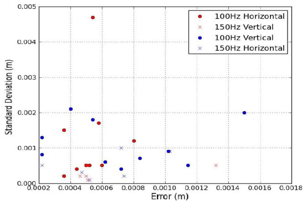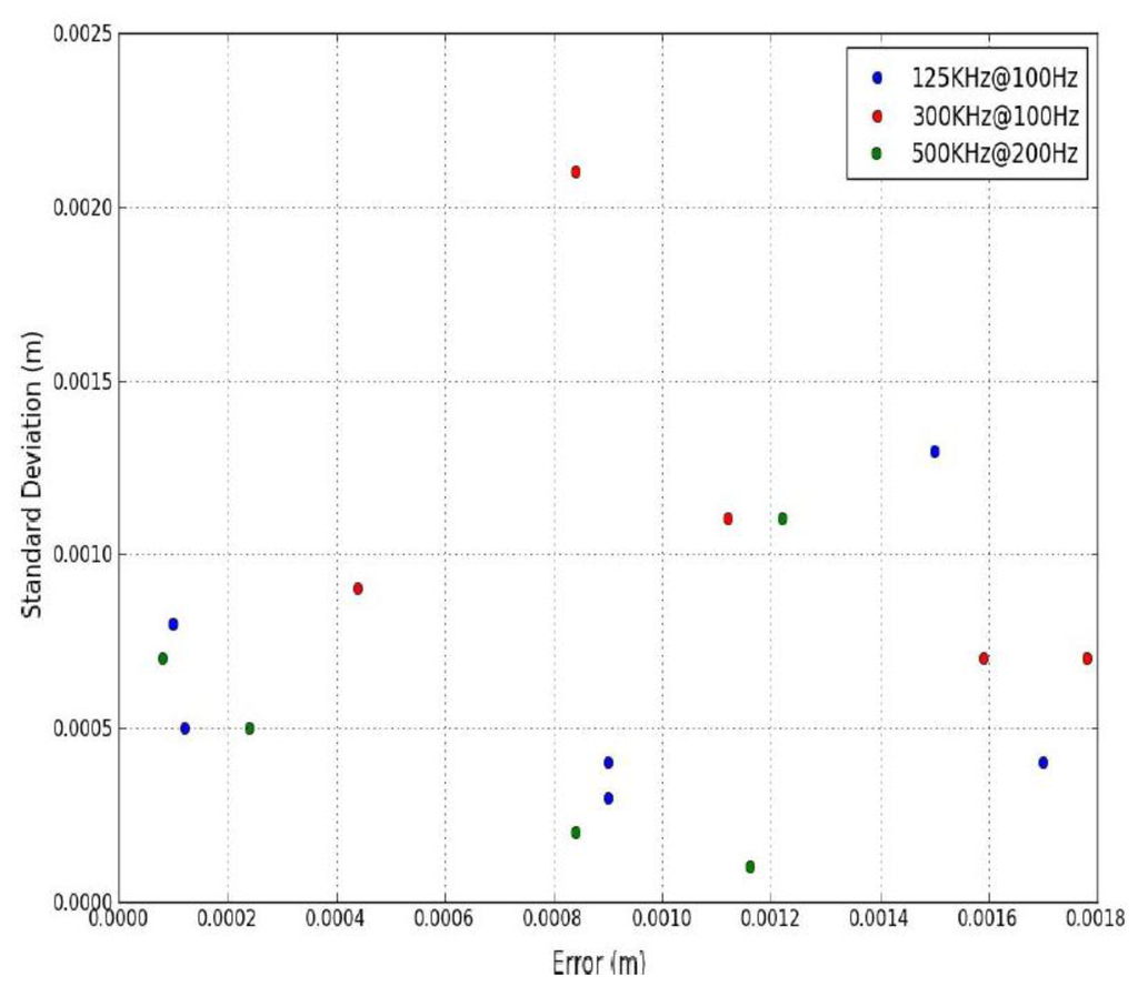 The distance between subsequent points on the angled surface was measured manually for real-world point cloud data, so this once again introduced a potential error. Point spacing was measured five times on 16 targets and σ calculated to provide an estimate of the quality of the 80 measurements. Targets 1–6 were surveyed using the XP1's Riegl VQ-250 operating at a 300 kHz PRR with a Mf of 100 Hz and Targets 7–11 by the Optech Lynx operating at a 125 kHz PRR and with a Mf of 100 Hz. Targets 12–16 were surveyed using the same scanner operating at a 500 kHz PRR and a Mf of 200 Hz. By altering the target rotation for each test, the range to the target, the height difference between the scanner and target, the PRR and the Mf, MIMIC's capabilities of predicting point spacing were tested robustly. Figure 8 illustrates the error plotted against σ. The highest σ was approximately 2 mm however, the majority of the measurements displayed less than 1 mm. The largest error was less than 2 mm at a range of approximately 8 m. These results validate MIMIC's calculations using real-world MMS datasets.