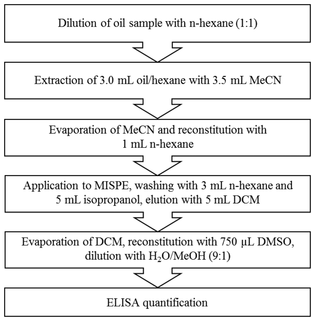 In this work, for the first time, we combined molecularly imprinted solid phase extraction (MISPE) and ELISA for analyzing B[a]P in edible oils. In addition, in contrast to earlier investigations, which focused on the preparation of MIP for B[a]P using the target analyte as template, we selected less toxic and cheap PAH template molecules for creating affine binding sites also to higher annelated compounds like B[a]P [42]. An extraction method was developed which permitted sensitive B[a]P analysis in the legally relevant concentration range using an ELISA procedure. Calibrations were made for different kinds of vegetable oil and recovery rates were tested using an olive oil reference material.