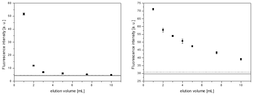 For elution of B[a]P, DCM proved more practicable compared to MeCN. With the latter, B[a]P could still be detected in the eluate after addition of 10 mL of solvent, while with DCM B[a]P fluorescence intensity practically equaled the blank after application of 5 mL of solvent. The B[a]P elution, therefore, was carried out with 5 mL of DCM in all following experiments.