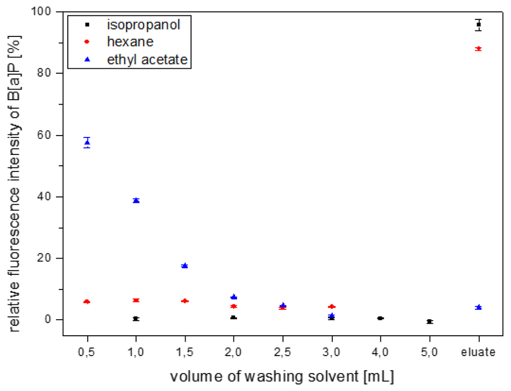 Thus, n-hexane, isopropanol and ethyl acetate were tested for their ability to retain bound B[a]P on the MIP column during the washing step. In detail, B[a]P dissolved in n-hexane was loaded on the column, then the column was washed fractionately with one of the three solvents and finally, B[a]P was eluted using 5 mL DCM. The B[a]P concentrations in the washing fractions as well as the eluates were determined by fluorescence spectroscopy (Figure 4).