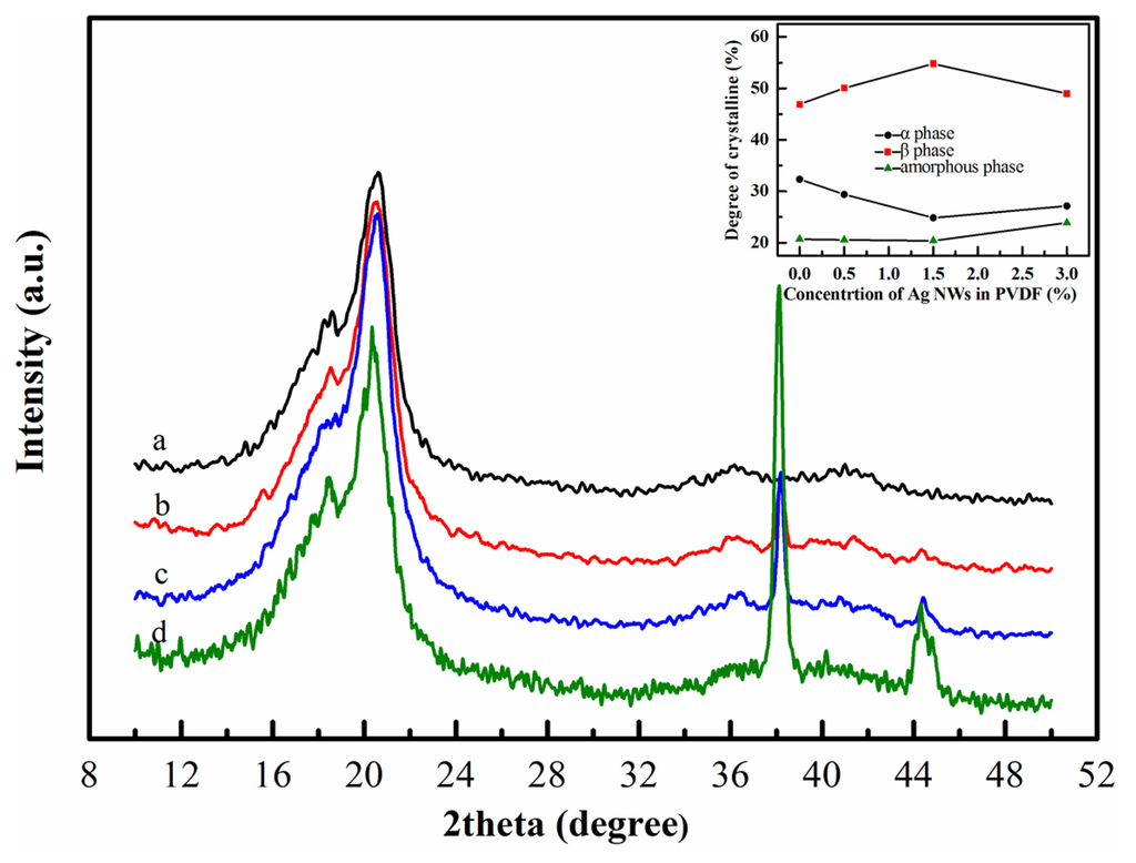 It is notable that doping Ag NWs into PVDF has a distinctive effect of both enhancing the crystalline β phase and weakening the crystalline α phase. This effect is closely related to the concentration of Ag NWs. For the spectrum of 0.5 wt% Ag NWs doped PVDF (curve b in Figure 3), the intensities of the crystalline β phase absorption bands at 1276 and 839 cm−1 improve compared with that of pure PVDF (curve a in Figure 3). The improvement remains as the concentration of the Ag NWs reaches up to 1.5 wt%. However, when the concentration of the Ag NWs is 3.0 wt%, it becomes complicated. As indicated by curve d in Figure 3, the intensities of the absorption bands at 1276 and 839 cm−1 decrease and those at 796 and 762 cm−1 increase compared with that of 1.5 wt% Ag NWs doped PVDF. Since Ag NWs have an electron-rich surface, C-F bonds on the polymer chain are electron-deficient groups. The UV-Vis spectrum and ATR-FTIR (Figure 7) indicate the interactions between Ag NWs and PVDF, which force the polymer chain to expand in a TTT conformation and overlie on the surface of Ag NWs. This local trans conformation may facilitate the nucleation of a polar β phase, which was confirmed in other studies [10,17]. However, the initial α phase nucleation is hard to form in the bulk matrix since they are induced by the thermal motion of polymer chains. Also, adding Ag NWs prevents TGTG conformation (α crystalline form). Nevertheless, when the concentration of Ag NWs increases to 3.0 wt%, too many β phase spherulites form and tend to squeeze together, so crystalline α phase is likely to form in the inter-region between spherulites corresponding to an amorphous-like phase, which also was discovered by Drzal's group who doped exfoliated graphite into polypropylene [21]. It is proved that the amorphous phase and crystalline α phase increase from the insert graph in Figure 2. The mechanism of β phase enhancement may be similar to the effect of exfoliated graphite doped into polypropylene [21] and palladium nanoparticles doped into PVDF [17], where the dopants not only act as a crystal nucleus but also affect crystal structure of the matrix. Furthermore, the X-ray diffraction results (Figure 2) are in accordance with the FTIR analysis (Figure 3) in that the composite of 1.5 wt% Ag NWs doped PVDF nanofiber web is observed to possess the most crystalline β phase and the least crystalline α phase. Furthermore, the nanofiber web is obtained using electrospinning whereby a huge DC voltage is applied between the tip of the syringe and the collector. The β phase is preferentially polarized through the DC voltage, which was ascertained by Kim's group [22].
