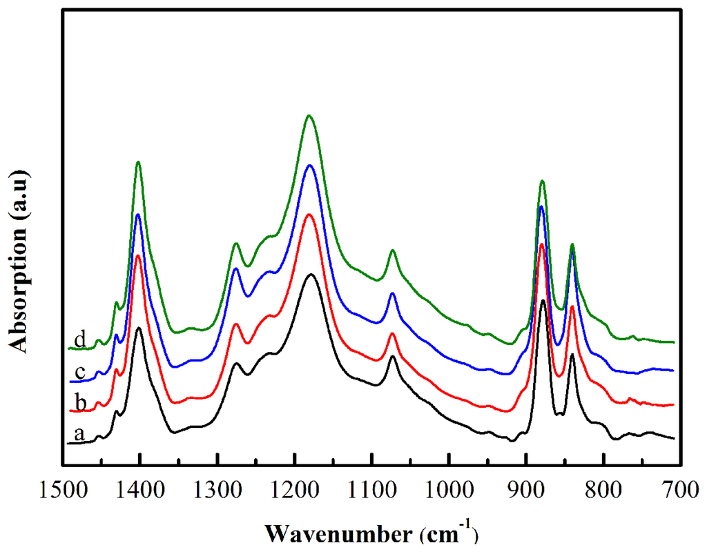 The X-ray diffraction curves of nanofiber webs are shown in Figure 2. The sharp diffraction peaks at the 2θ value of 38° and 44° present the (111) and (200) reflection planes of Ag NWs, respectively. For pure PVDF nanofiber web (curve a in Figure 2), a strong and broad diffraction peak at the 2θ value of 20.6° corresponds to (200) and (110) reflection planes of the crystalline β phase. The shoulder peak at the 2θ value of about 18.2° corresponds to (020) and (100) planes of crystalline α phase. In addition, the distinctive peak at the 2θ = 36.5° correspond to crystalline β phase. For the curves of the nanofiber webs doped by Ag NWs (curves b, c, d in Figure 2), the diffraction peak of crystalline β phase at 2θ = 20.6° rise and the diffraction peak of crystalline α phase at 2θ = 18.2° weaken compared with that of pure PVDF. The ATR-FTIR spectrums of the nanofiber webs (Figure 3) corroborate the X-ray diffraction results. The absorption peaks at 1276 and 839 cm−1 are typical vibration characteristics of crystalline β phase, where the intensities increase after doping Ag NWs into PVDF, while the intensities of the absorption peaks at 977, 796 and 762 cm−1, which are attributed to the crystalline α phase, drop after doping Ag NWs into PVDF.