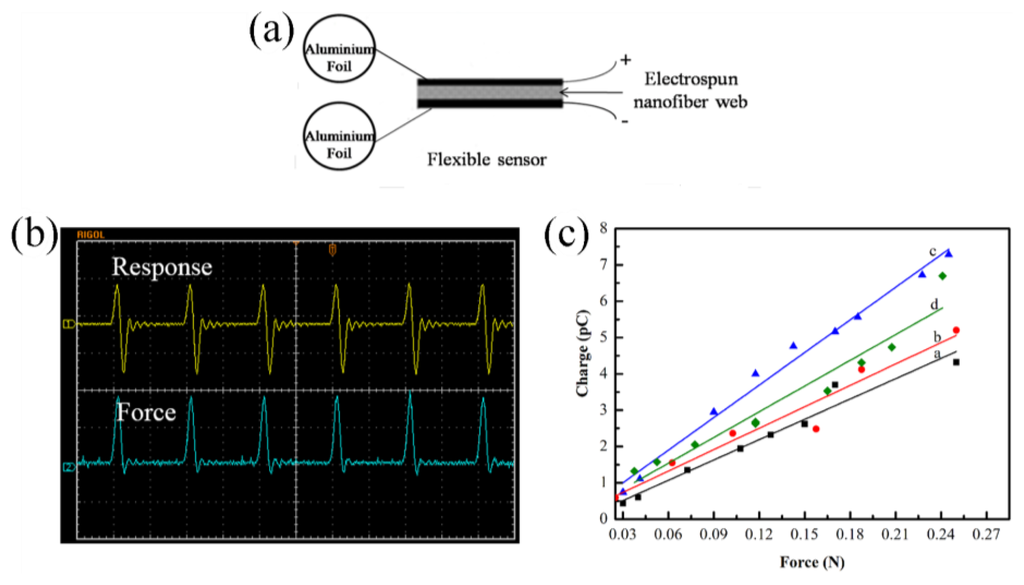 - Ren, G.Y.; Cai, F.Y.; Li, B.Z.; Zheng, J.M.; Xu, C. Flexible pressure sensor based on a poly(VDF-TrFE) nanofiber web. Macromol. Mater. Eng. 2012, 298, 541–546. [Google Scholar]