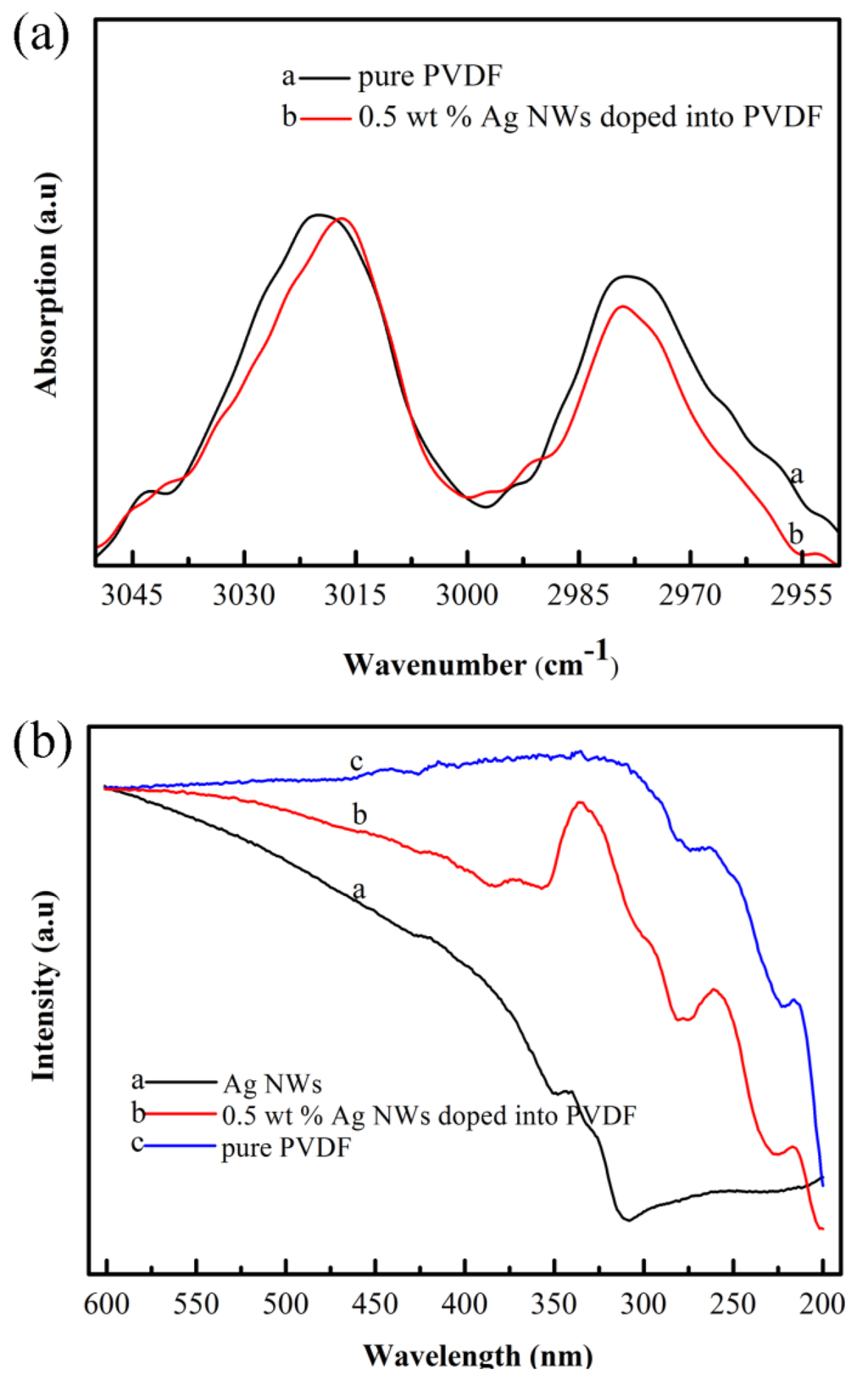 The interactions between PVDF matrix and Ag NWs are characterized using UV-Vis spectrophotometry and ATR-FTIR (Figure 7). For the UV-Vis spectra (Figure 7a) of the nanofiber webs, the absorption peaks at 219 nm and 260 nm are attributed to PVDF. The absorption peaks of Ag NWs are located at 324 nm and 341 nm. Comparing curves a and b in Figure 6a, it is found that the absorption peaks of Ag NWs doped into PVDF nanofiber webs have a slight red shift, which indicates the interactions between the polymer chains and Ag NWs surfaces. Also the FTIR results (Figure 7b) show a 3 cm−1 red shift of the absorption bands at 3021 cm−1 which represents the asymmetrical stretching vibration of C-H bond. Incorporating the TEM result (in Figure 6), they prove the previous hypothesis that the Ag NWs are beneficial for forming the initial β crystal nucleus. Metal nanowires such as Ag NWs, have electron-rich surfaces. Thus the local-dipole field of the electron-rich surfaces impel polymer chain to exhibit a TTT conformation, causing the polymer chains to align on the surfaces of Ag NWs and form crystalline polar β phases.