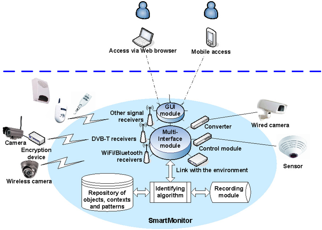 Logical and physical architectures reflect the system's shape. There are several essential and crucial elements which constitute a core of the system. The most important system components are: the multi-interface module, graphical user interface module, signal receivers, control modules/converters, encryption devices, identifying algorithm, repository of objects, contexts and patterns, recording module and the system for the connection to the environment.