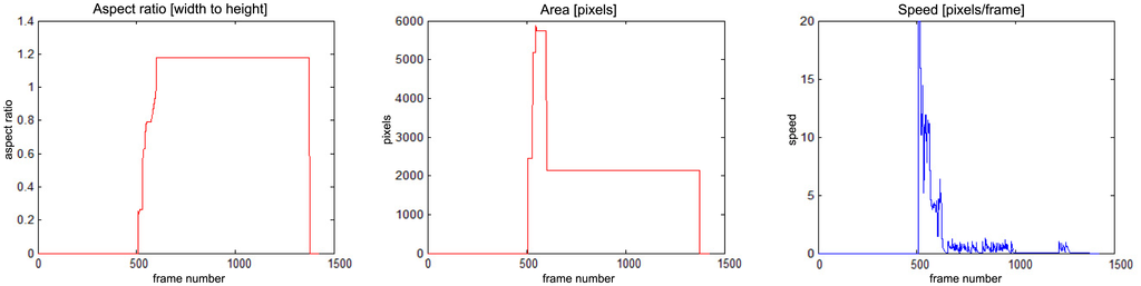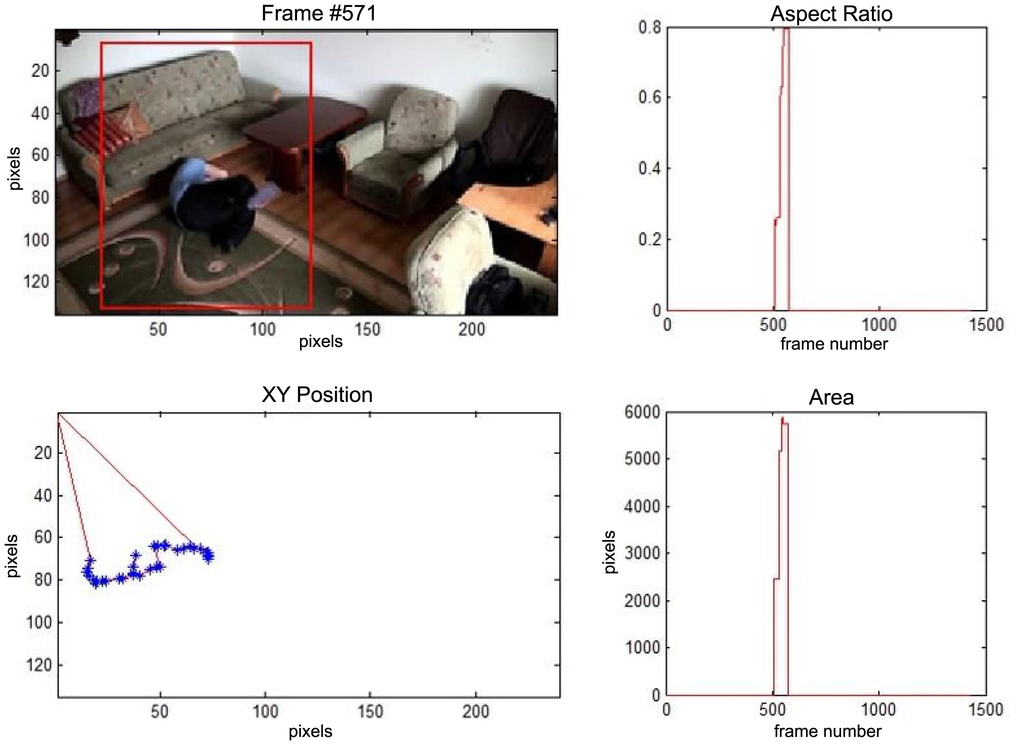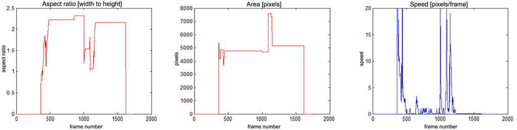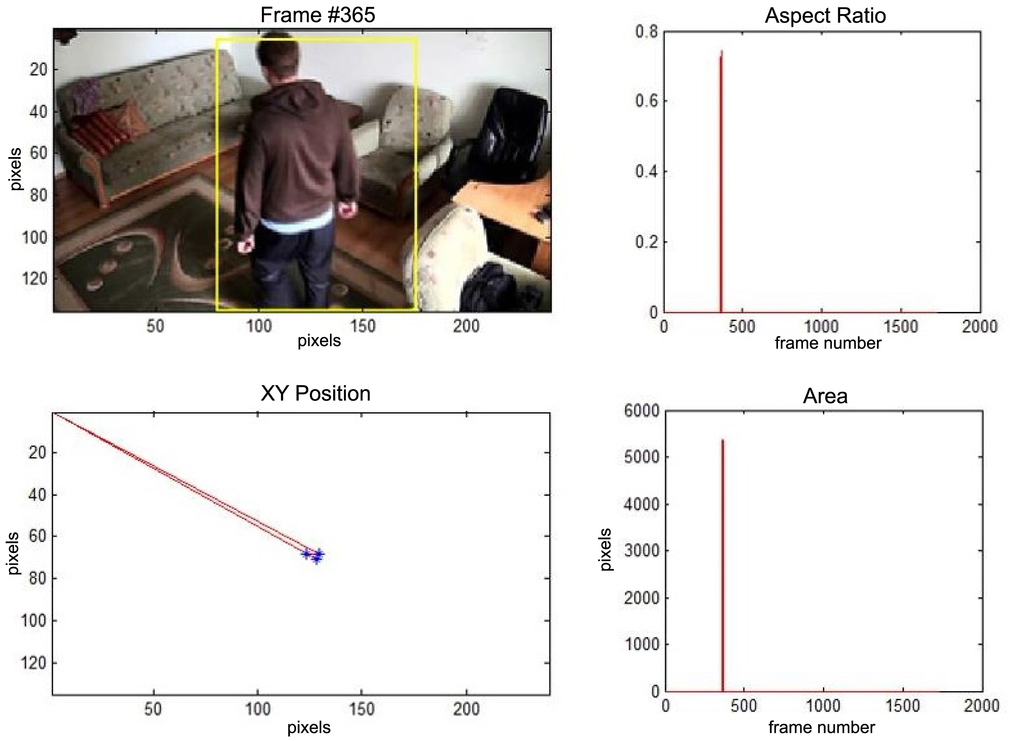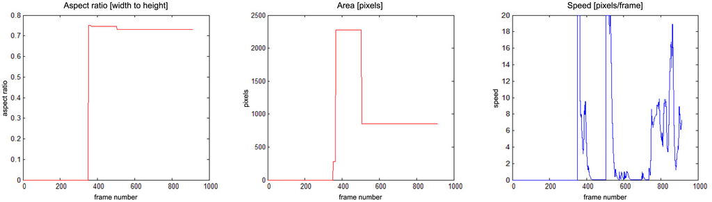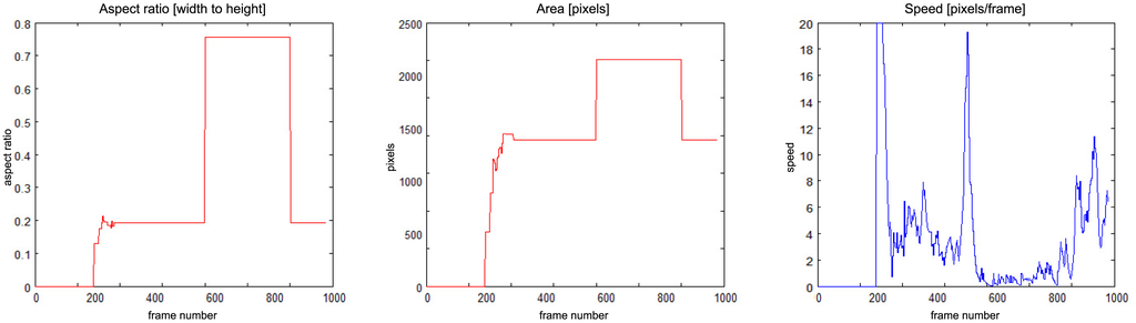 The results of fall detection for four sequences are presented in this subsection in a form of charts showing the variability of parameters values. In Figure 13 one can observe that the fall occurs around frame No. 600. The aspect ratio stays constant while the area is smaller than the original object. At the same time the speed of movement is close to zero. If all of these values are constant during a predefined number of frames (time), the alarm is triggered.