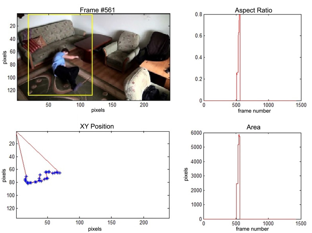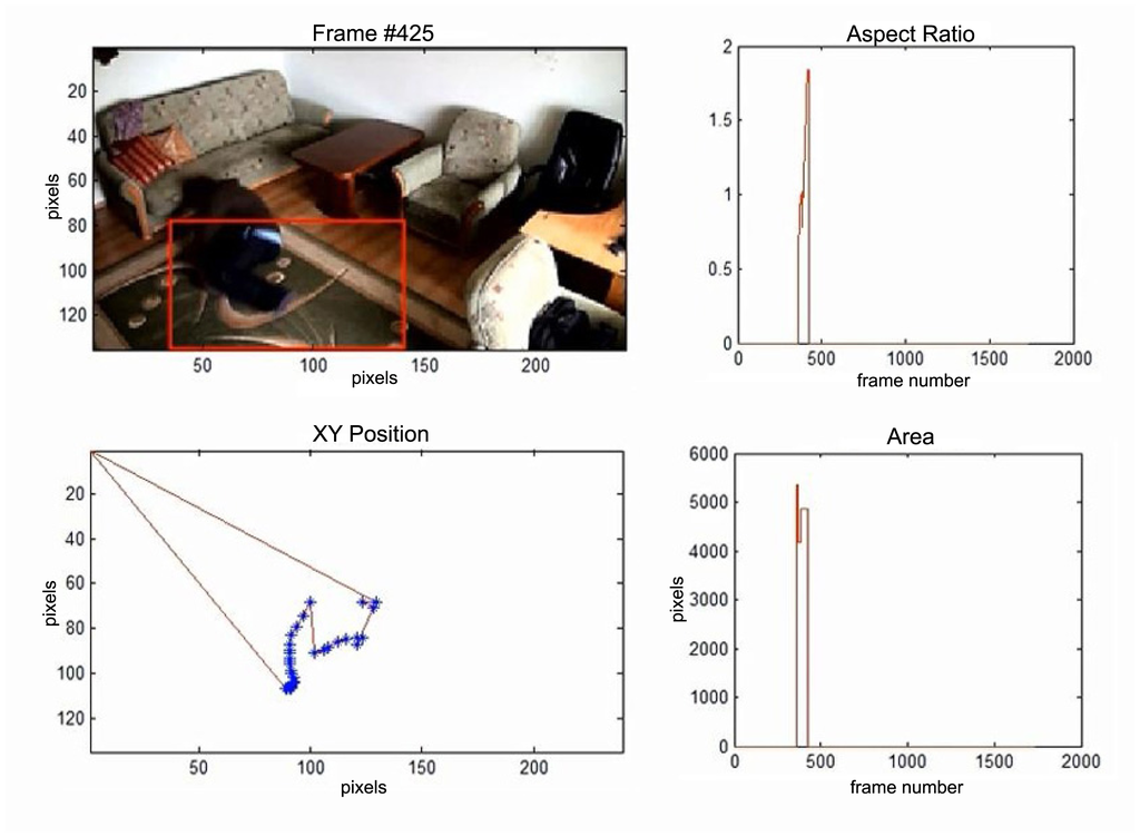Due to the fact that this paper focuses on the supervision over ill persons, this section deals with the analysis of human silhouettes moving indoors for events detection, particularly faints or falls. In the fall detection scenario we employ a mixture of three commonly used measures, namely: bounding box representing the person [40–42] in the image, its area (denoted in pixels) and a relative speed in the image plane. This method works even if the camera is placed sideways and it does not depend strongly on the camera mounting height (i.e., [43,44]). In contrary to Lee and Mihailidis [43] we detect falls without setting special thresholds for usual inactivity zones like the bed or the sofa. It seems also not necessary to calculate more detailed silhouettes, like in work of Nait-Charif and McKenna [44]. According to our observations, it is also not justified to employ more sophisticated calculations, like large human shape deformation during a fall [45,46] or the three-demensional (3D) vertical velocity [47,48]. The most important is the set of rules that join simple, yet effective geometrical measures. The successful human being identification depends, then, on a rather simple calculations.