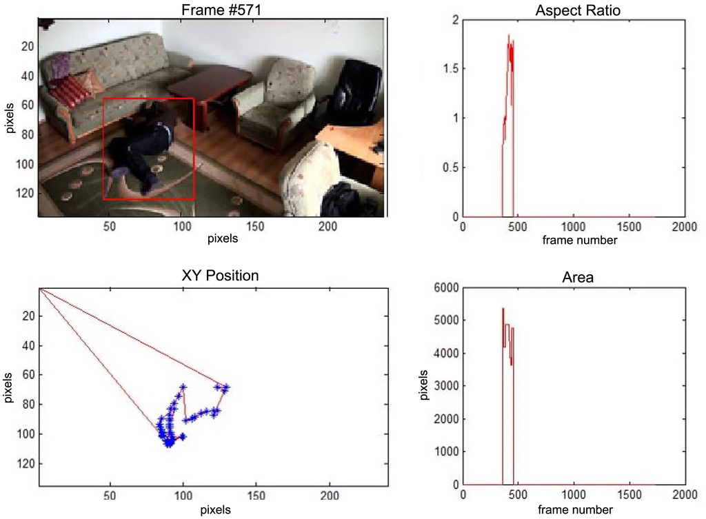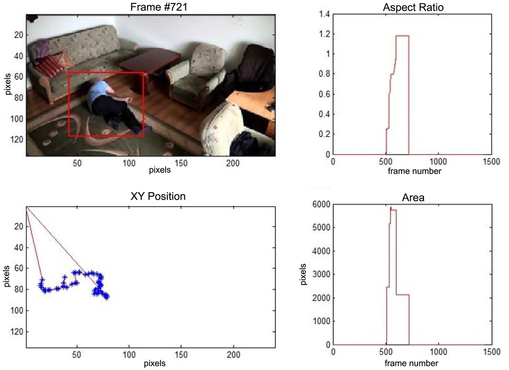 During the experiments, various video sequences simulating the situation of a fall were used. The position of the human body after the fall in relation to the eye of the camera differs. The video processing model along with the initial system parameters are provided in the fourth section. The input files were retrieved on a sequential read, i.e., at a particular moment only an individual frame was available. It was assumed that the aspect ratio of a standing person's bounding box is close to 0.5. When the aspect ratio rapidly exceeds this threshold and is larger than 0.7, it means that a fall has occurred. The aspect ratio of a bounding box is calculated over several frames, which may represent from 1 to 2 s, depending on the fps. For the second parameter, P, a change of the object's centroid position is verified. If the centroid position does not change significantly during a specified period of time, the alarm is triggered. The area of the object's bounding box is also considered during the analysis of the video sequences.