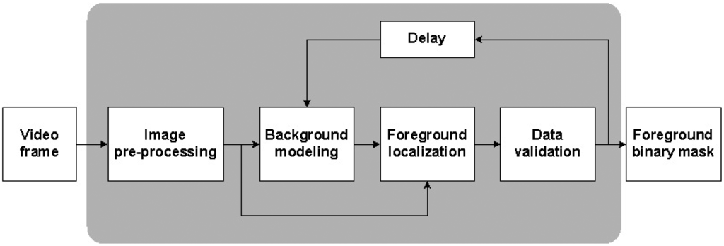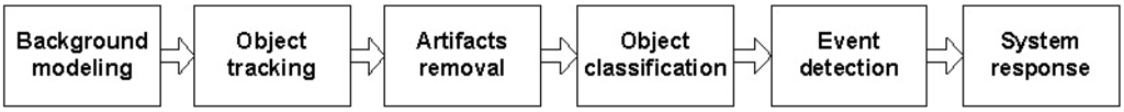Background modeling detects motion on the basis of the background subtraction process (see Figure 3). As a result of this process, the foreground binary mask is obtained and only objects larger than a pre-specified size are considered as objects of interest (OOIs) for the system. Extracted objects are then tracked under the tracking module. The tracking process is based on the estimation of an object's positions in the subsequent frames. These positions create an object's trajectory. Multiple objects are additionally labeled to maintain the continuity of tracking. Trajectories can be compared in order to recognize potentially dangerous behaviors. The artifacts removal module aims to remove redundant areas from the foreground binary mask, i.e., regions which were mistakenly included in the foreground image. The object classification module enables simple classification of objects on the basis of their parameters or comparison with pre-defined templates. The event detection module focuses on detecting object changes, especially changes in shape and motion. Depending on the user's safety rules or the system's operational status, the system can react to sudden movement, shape change or the lack of movement. System response module determines the system's reaction to the detected event according to the rules set by the user.