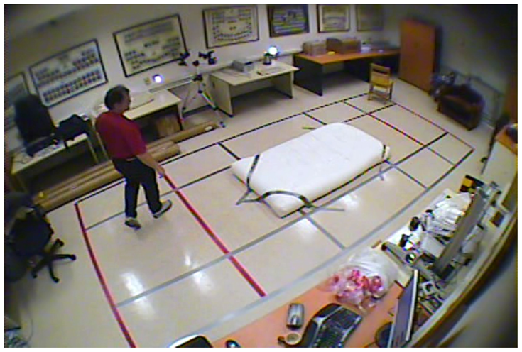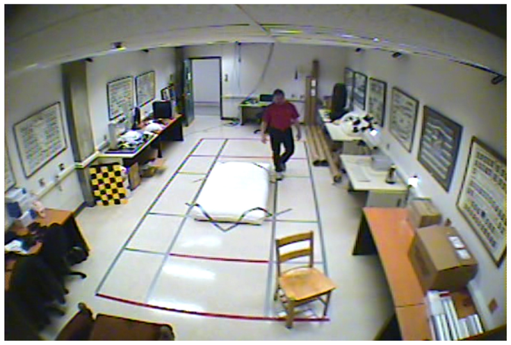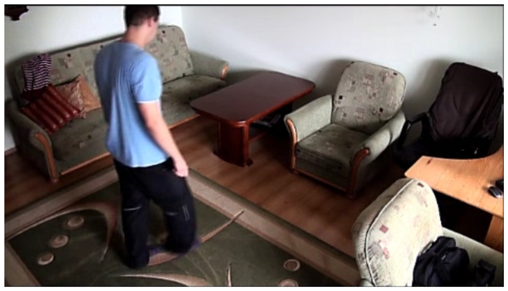 In our experiments we used two datasets, each one consisting of several video streams captured in real environment. The first dataset (“SM”—SmartMonitor) is our own benchmark, and consists of four sequences of humans who walk and faint in the small room. The second dataset (“chute”) comes from a technical report coming from Universite de Montreal (UdM), presented in [49]. It consist of multiple sequences, each one presenting different events where the fall is only one of them. This dataset contains 24 sequences recorded with 8 IP video cameras. Sample frames from the benchmark datasets are presented in Figures 4, 5 and 6. The video sequences contain typical difficulties which can lead to segmentation errors like: