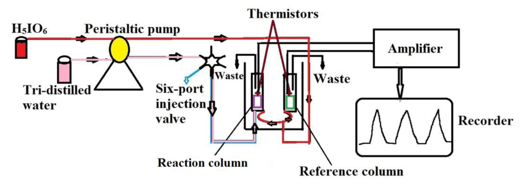 We have developed a thermal biosensor for use in COD determination. The biosensor measures the amount of heat released during the oxidation of organic compounds in the test water samples [24–26]. The flow injection analysis (FIA) technique is normally used along with the assay [27]. Therefore, the amounts of the carrier solution and the test water sample can be readily controlled using this continuous analysis technique [28]. The height of the thermometric peak is proportional to the change in the enthalpy of the organic content in the test water sample [29,30]. In contrast to other devices used for COD measurements, the thermistor is insensitive to the optical, electrochemical, and other material properties of the test sample. Therefore, the degree of interference owing to the characteristics of the test sample is extremely low, and the obtained COD values are highly accurate [31]. In addition, the detection efficiency of the thermistor is very high.