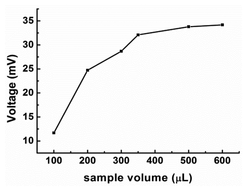 On increasing the sample volume, the response signal also increased for volumes of up to 350 μL. For volumes greater than this, the signal remained steady. The differences in the response signal values corresponding to sample volumes of 350, 500, and 600 μL were not statistically significant. Hence, we used samples of 350 μL in the study.