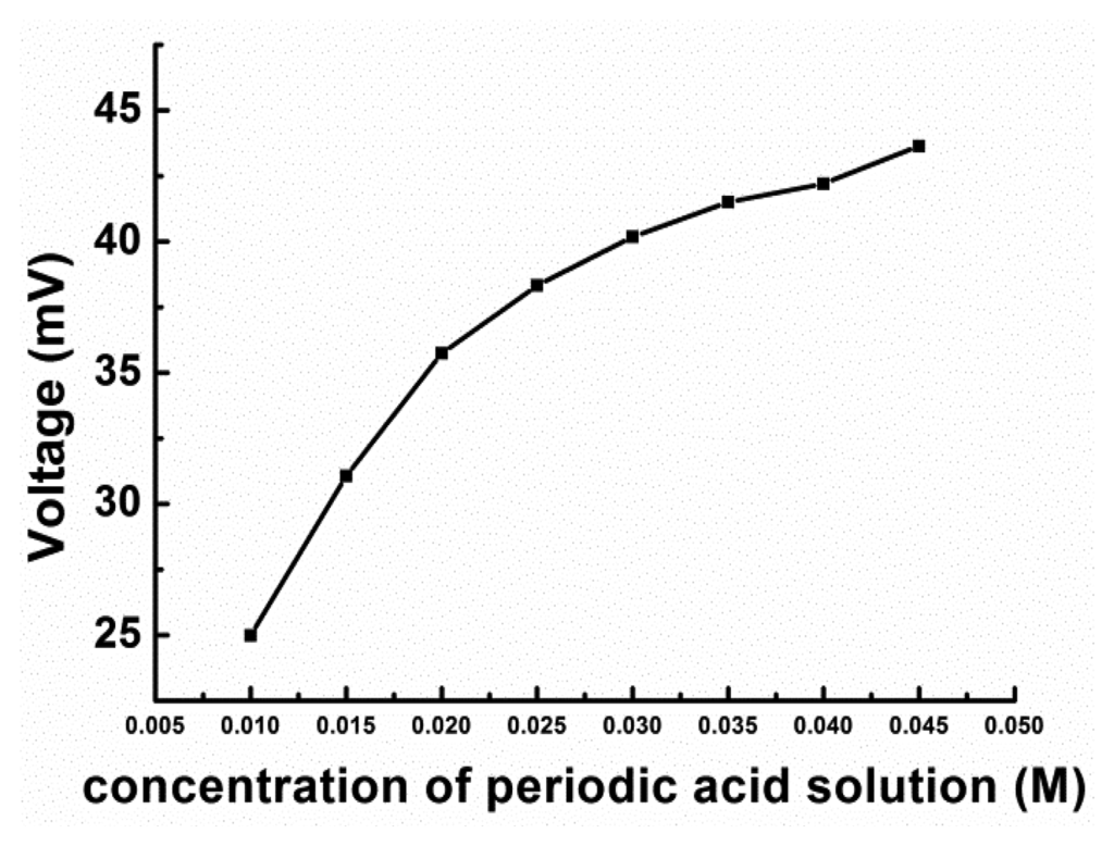 The signal was the steadiest for a concentration of 0.03 M; on the other hand, significant drift from the baseline was noticed when the concentration was greater than 0.03 M. H5IO6 solutions of high concentrations might damage the instruments owing to their high corrosivity. Therefore, on the basis of this set of results, an H5IO6 solution with a concentration of 0.03 M was employed for the assays.