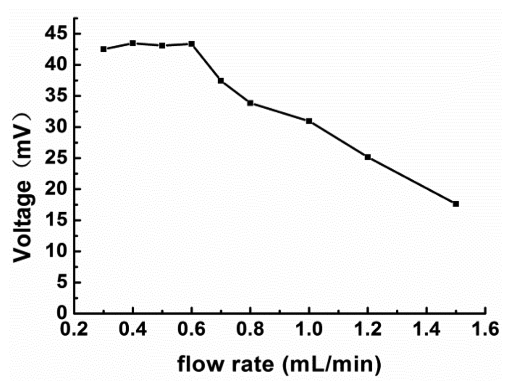 Some studies have suggested that the flow rate has an effect on the response signal and that a suitable flow rate value is 0.5 [26,28] or 1.0 mL/min [24,31]. After investigating the effects of the flow rate, we found that a value of 0.6 mL/min was the most suitable for this study. The related data are displayed in Figure 4.