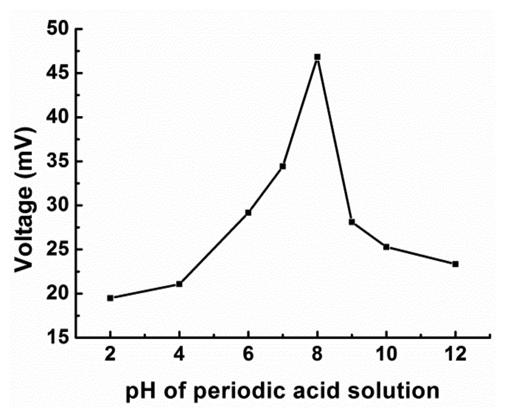 The results of preliminary experiments showed that the pH of the H5IO6 solution also impacted the assay results. An alkali was used to adjust the pH of the H5IO6 solution, and the most suitable alkali from among NaOH, Na2HPO4, and CH3COONa was chosen. The thermal response signals for a 937.5 mg/L glucose solution with a pH of 5 at a flow rate of 0.6 mL/min are listed in Table 1. The mean voltages corresponding to NaOH, Na2HPO4, and CH3COONa were 279.325, 325.156, and 233.644 mV, respectively. Thus, the responses in the cases of Na2HPO4 and CH3COONa were much higher than that obtained using NaOH. Moreover, when Na2HPO4 or CH3COONa was used to alter the pH, the H5IO6 solution grew turbid, and pH values of 8 and 10 could not be achieved. Therefore, we used NaOH to adjust the pH of the H5IO6 solution.