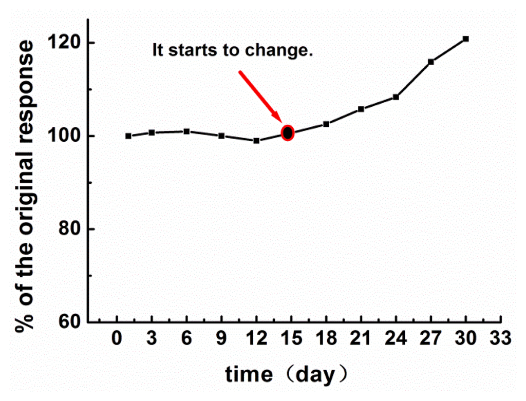 The long-term stability of the oxidant during storage is one of the key factors influencing oxidant performance. We monitored the stability of H5IO6 over one month using a 93.75 mg/L glucose solution. The data, which were collected every three days, are displayed in Figure 6. It was found that the stability, which was defined as the percentage of the original response elicited, changed little from day 1 to day 15, but increased slightly between day 15 and day 30.