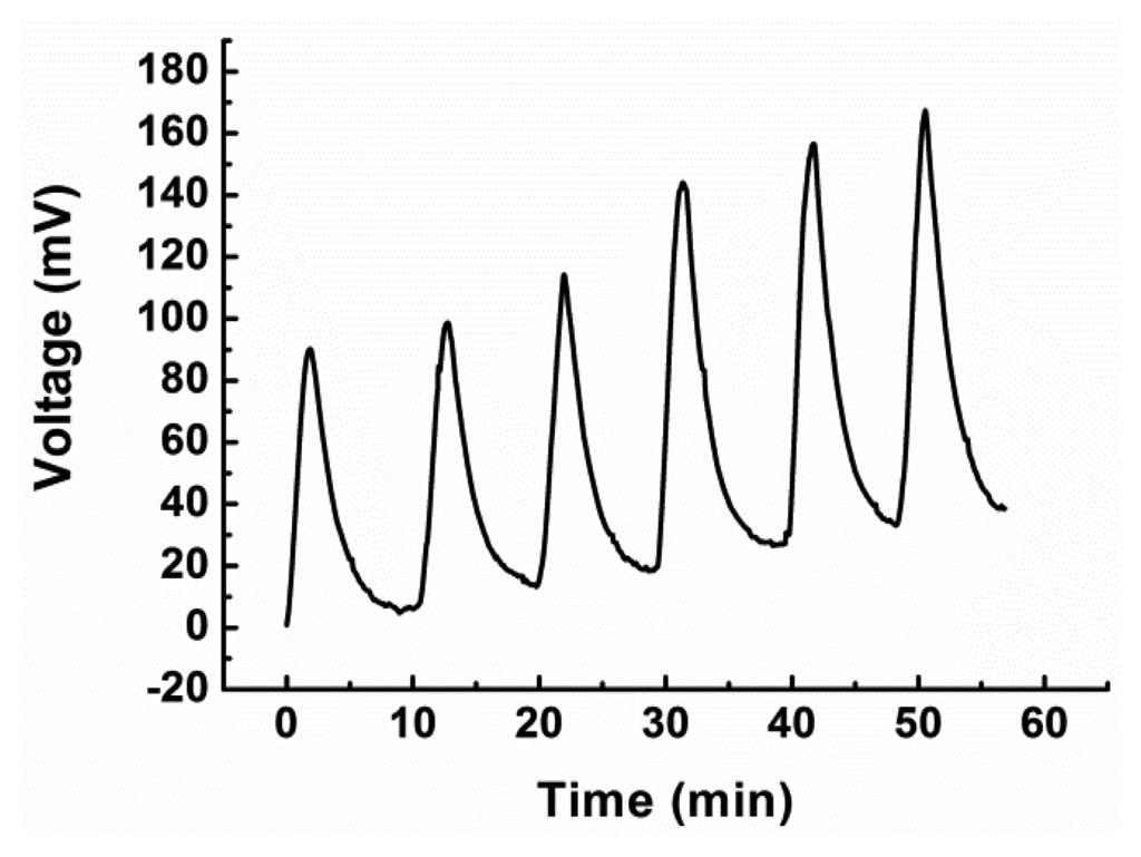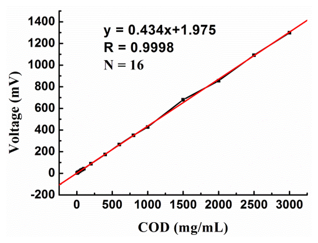 The reproducibility of the responses obtained was investigated by measuring the voltages corresponding to a COD of 100 mg/L. The relative standard deviation (RSD) was 0.58% for a set of 11 values in a day and 4.48% for 72 samples in 20 days. The intraday and interday variations were 0.44% and 0.88%, respectively; both values were lower than 1%. Thus, the sensor exhibited highly reproducible behavior.