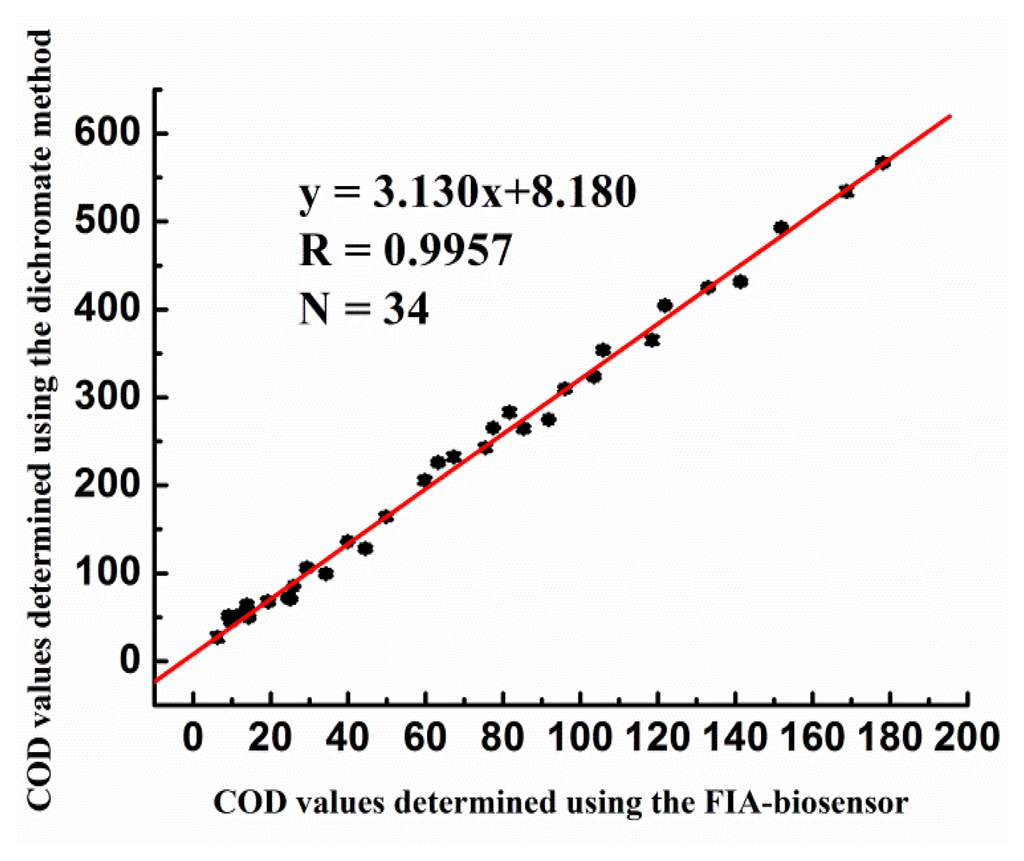 Any new measurement technique has to be compared with existing techniques, and the results obtained using the new technique must agree sufficiently well with those obtained using the conventional methods in order for the new technique to find wide application. Figure 9 shows the correlation between the results obtained using the dichromate method and those using the thermal biosensor; the values in the case of the thermal biosensor are shown on the x-axis, while those corresponding to the dichromate method are shown on the y-axis.