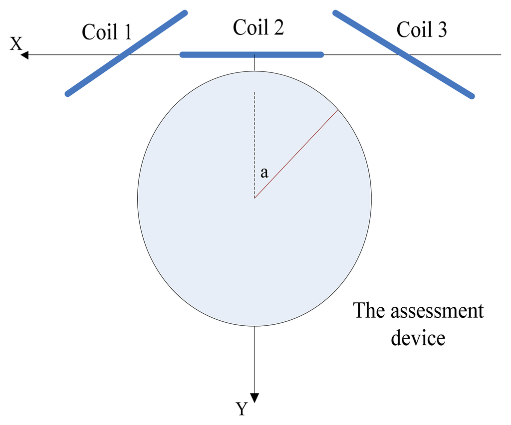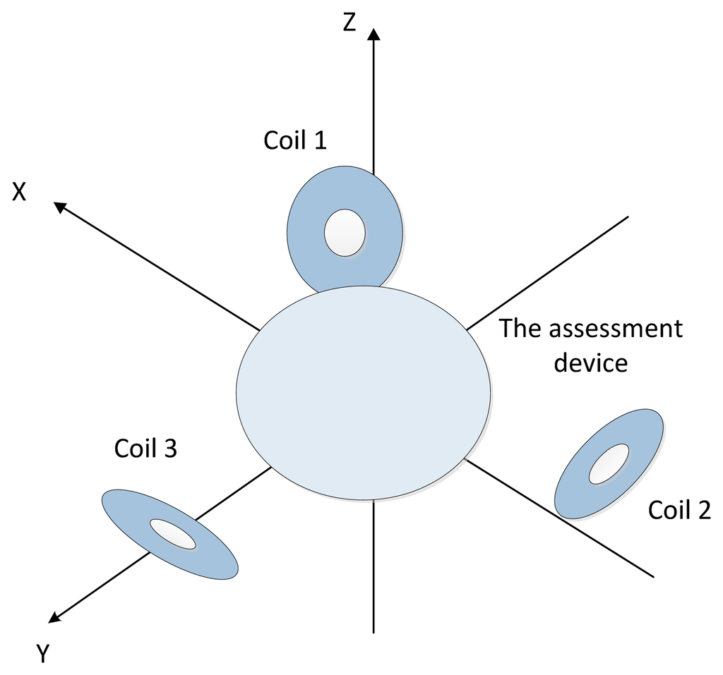 The second style was as demonstrated in Figure 10. Three coils were expressed as Equations (35)–(37), and measured points were Equations (38)–(40). All coordinates were obtained in centimeters too: