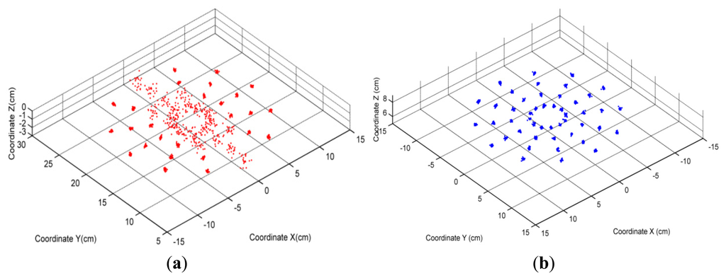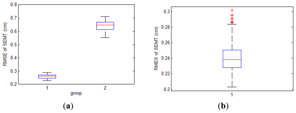 The tracking results for both two layout styles are shown in Figure 13. We can find the great differences between them. For the first layout style, distribution of SEMT's results is bimodal. On twenty-six points—which are defined as group 1—measurements for the same spot are less dispersive between each other. Meanwhile on other twenty-two points (group 2), dispersions are much larger. For the second layout style, all forty-eight points share similar distributions which are almost the same as group 1 in the first style.