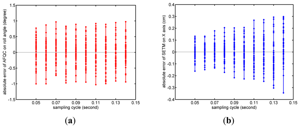 In the fourth experiment, influences of the sampling cycle on the accuracy in dynamic tracking were tested. In the algorithm structure sections we have proven that the sampling cycle can affect the accuracy of both AFQC and SEMT. To measure specific relations between them, a group of contrast experiments were carried out, in which sampling cycles were set as 0.05, 0.06, 0.07…0.14 s. For every different cycle, results of roll angle and positional measurement on X axis were recorded, and the corresponding absolute errors were then worked out.