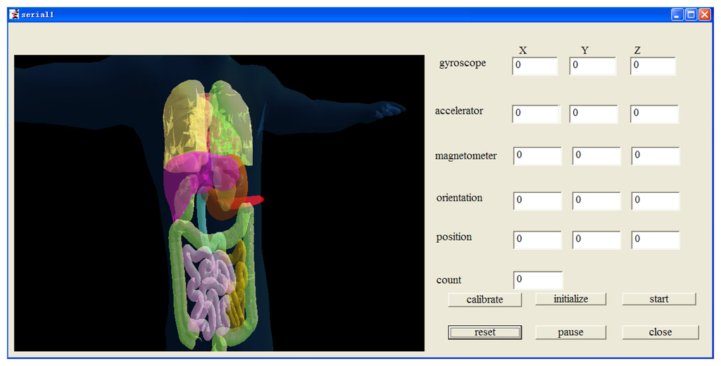 Our overall scheme is shown in Figure 1. The system can be divided into four parts. Part 1 is the MARG sensor, which consists of an InvenSense MPU6050 (InvenSense, San Jose, CA, USA) 16 bit resolution inertial measurement unit (containing a gyroscope and an accelerometer) and a 16 bit resolution Honeywell HMC5883L magnetometer (Honeywell, Morristown, NJ, USA). With suitable printed circuit board (PCB) design, the sensor is minimized to ensure that it can be sealed in a glass tube with a diameter of 8 mm, which is shown in Figure 2. Part 2 is the coil array, including three symmetric cylindrical coils. The thickness of coils is 1 cm and the radius is 8 cm. With proper arrangement, they can suitably encircle patients' abdomens. Part 3 is the control system, containing a C8051F340 MCU and a PC. The MCU is responsible for collecting and uploading raw sensor data with a frequency of 20 Hz, as well as exciting the coils under the control of the computer. Part 4 is display unit used to display our application's interference that is shown in Figure 3 where the ultrasound scan section is demonstrated by a highlighted sector.