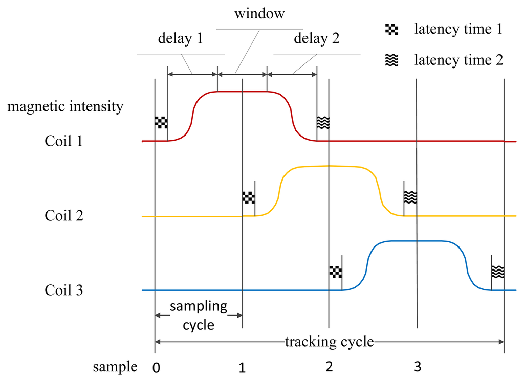 To achieve the work process above, we should strictly control the operating sequences of the three coils. Firstly, we add a latency time (latency time 1) between sample 0 and the beginning of charging Coil 1 to avoid possible disturbances. After that, a constant direct current (DC) voltage is applied on Coil 1. Because of hysteresis effects, there will be a delay (delay 1) before the magnetic intensity become constant. Then a sampling window with flat singles is available until Coil 1 begins to discharge. For control convenience, sample 1 is set at the absolute middle of sampling window. For the same reason, latency time 1 is also added between sample 1 and the beginning of charging Coil 2. Finally, after Coil 1 loses its magnetism completely and the added latency 2—which can avoid Coil 1's influences on later samples—sample 2 arrives. Because all three coils share the same electric and mechanical design, their control process has symmetry, and the sequences between sample 2 and the next tracking cycle are similar.