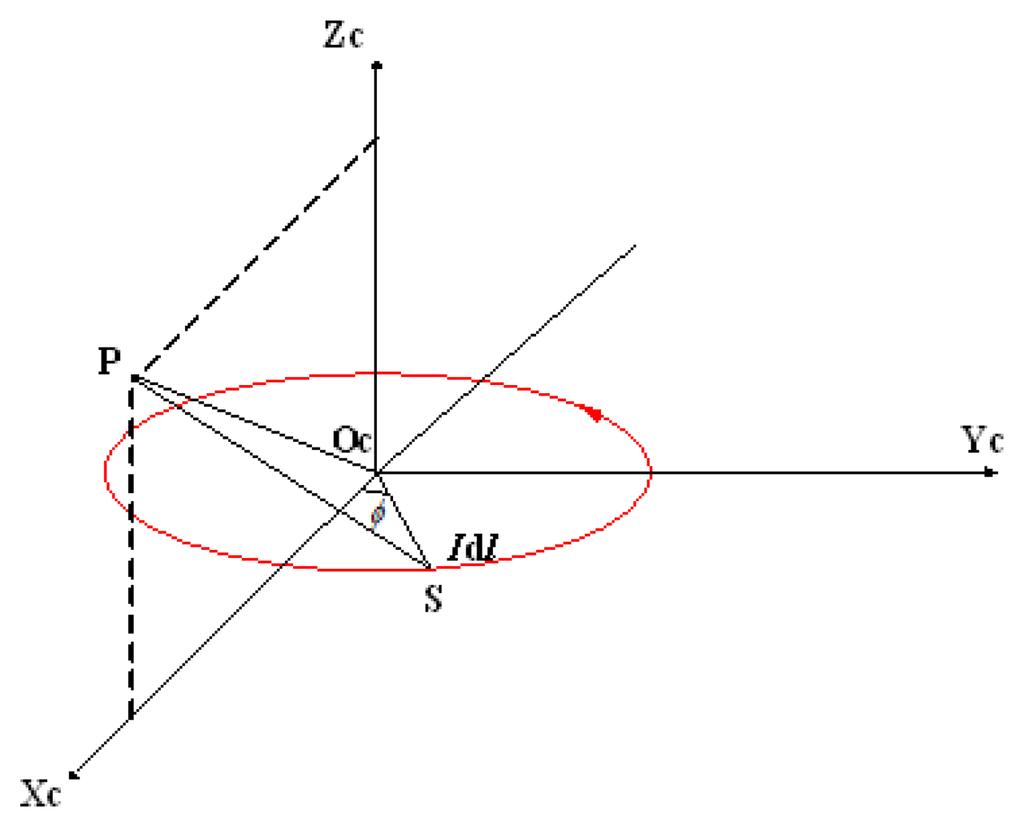 For a single turn circular coil—whose radius is a and carrying current is I —and an arbitrary point P, the orthogonal coordinate system OC − XCYCZC is built, which is shown in Figure 5. The base vectors of three axes are , , and . OC is located at the center of the coil. XC axis and YC axis are along radial directions of the coil. ZC axis is perpendicular to the coil. P is at the plane XCYCZC and its coordinate is (x, 0, z).