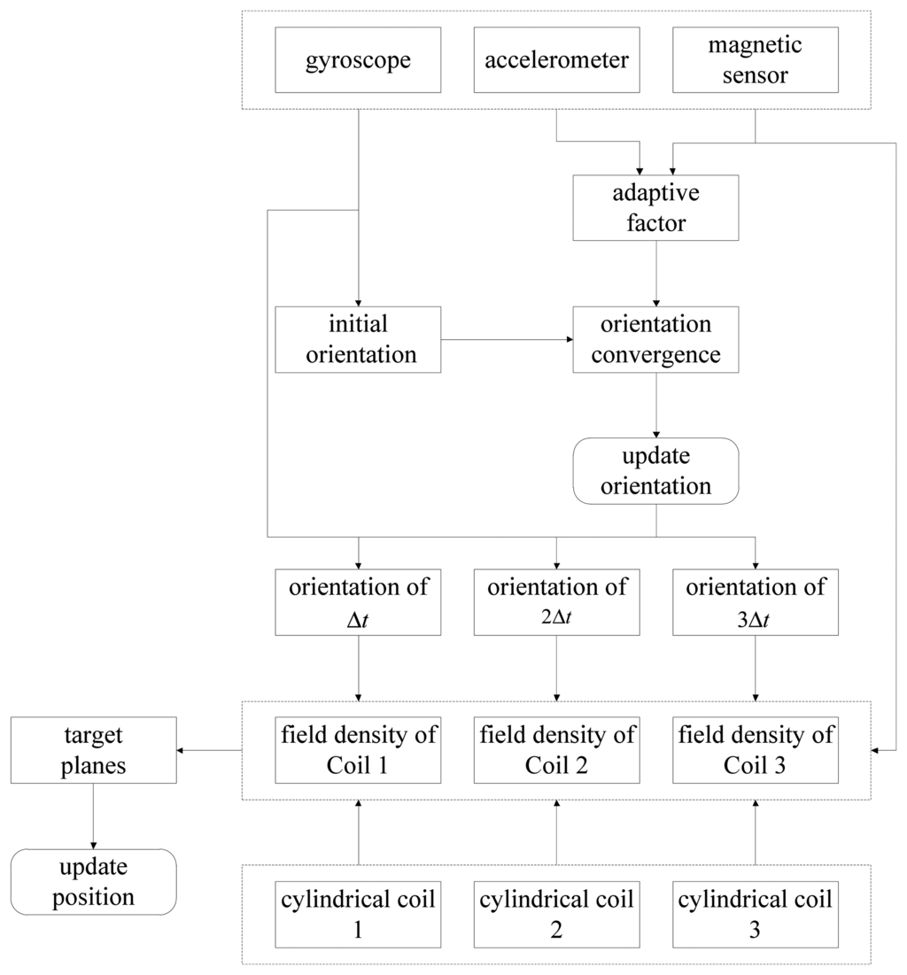 A typical tracking cycle consists of four sampling cycles. An arbitrary one is demonstrated in Figure 4, in which four samples are indicated as sample 0, 1, 2 and 3. In sample 0, the sensor array outputs polluted gravitational acceleration, polluted geomagnetic flux density and polluted angular velocity. The initial estimate of orientation is gained by integrating the gyroscope's signals. Then it is converged by the outputs of the accelerator and the magnetometer, where AFQC is designed to add adaptive disposal for reducing influences of the noises. On sample i (i = 1, 2, 3), the magnetometer measures the sums of Coil i and geomagnetic flux density, meanwhile the orientation is continually updated by the gyroscope. By synthesizing the information of samples from 1 to 3 and the result of AFQC, we can calculate the real-time position through SEMT.