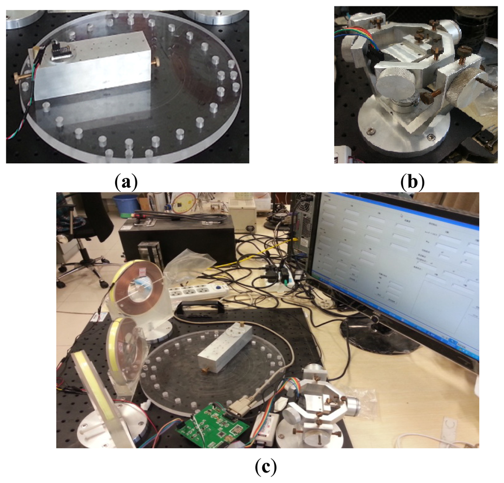 We designed an assessment device by simulating Hummel's scheme [31] to evaluate our localization results. The device can provide standardized attitude angle values every 15° from 0° to 360° and standardized position values on concentric circles with radii of 2.5, 5, 7.5, and 10 cm every 15° The experimental positioning range was bigger than the abdominal cavity volume of adults. We also introduced a three-axis turntable to assess orientation estimation in dynamic state. Axes of the turntable were equated with potentiometers. The standard values of orientation can be obtained by A/D conversion (Figure 8).