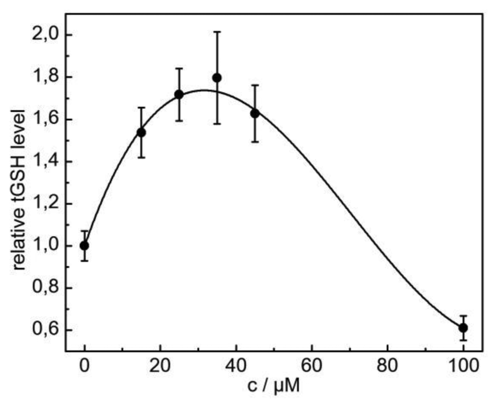 To determine whether the induction of HSP70B′ expression in HaCaT cells in response to CdCl2 exposure was in fact correlated with increased oxidative stress, we determined tGSH concentrations in transfected cells. Oxidative stress can act in three different ways on the glutathione pool in HaCaT cells [6]. First, CdCl2 may alter the ratio of the reduced sulfhydryl form of glutathione (GSH) to the oxidized glutathione disulfide (GSSG). Second, CdCl2 exposure affects the activities of enzymes that are involved in combatting ROS, such as superoxide dismutase, catalase, and glutathione peroxidase. Third, treatment with CdCl2 increases tGSH concentrations in the cells. As shown in Figure 1, a dose-dependent increase in tGSH concentrations in HaCaT cells in response to a CdCl2 challenge was observed. The maximal increase in tGSH of approximately 1.7-fold was achieved following the treatment of cells with 25–45 μM CdCl2 for 6 h, which was well below the range of general CdCl2 cytotoxicity in HaCaT cells as determined by MTT assays following 24 h of exposure (EC50 = 45 ± 7 μM) [9]. The limit of detection (LOD) of the applied tGSH assay was determined to be 1 μM CdCl2 following a 6 h incubation with the toxin. A CdCl2-induced increase in tGSH could be explained in principle by the oxidative stress-induced activation of signaling pathways that led to an increase in the de novo production of enzymes that are involved in glutathione biosynthesis [16,17].