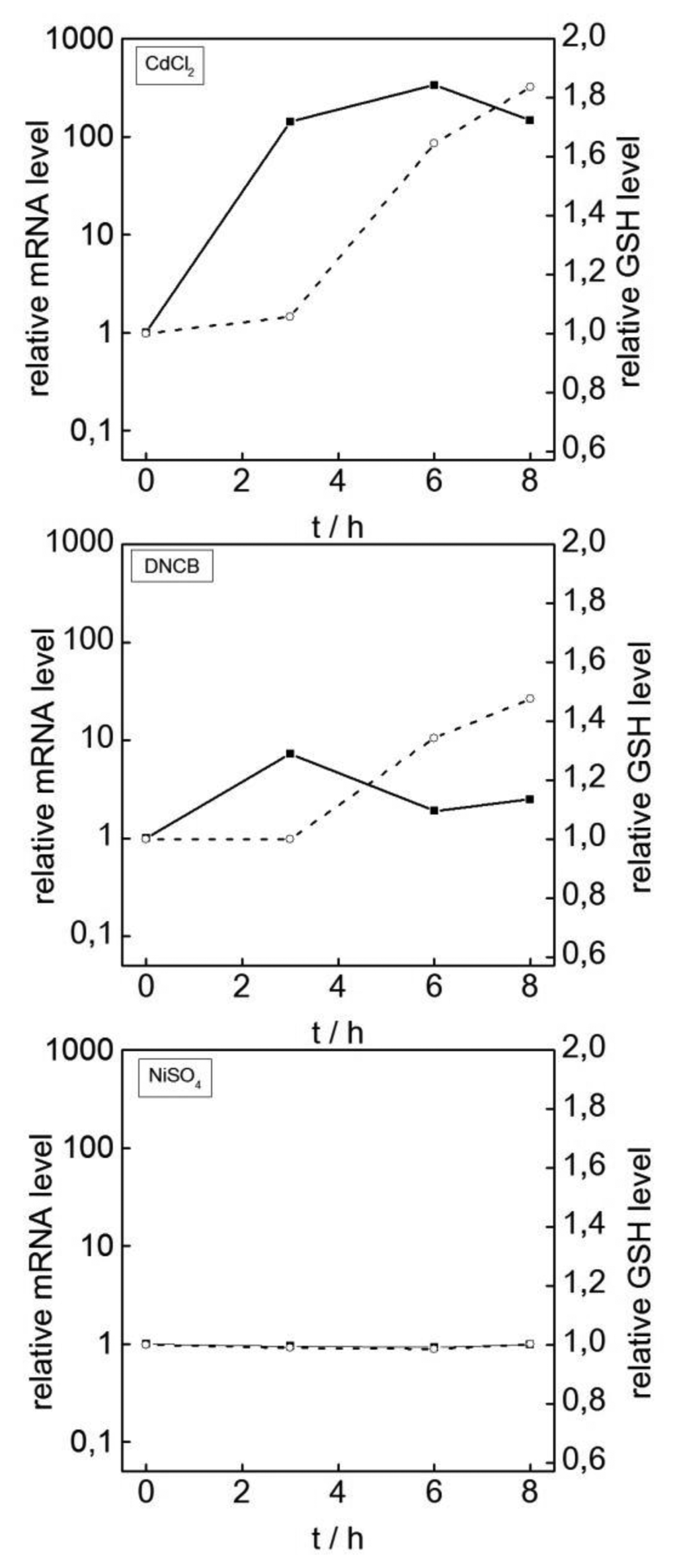 The molecular mechanisms underlying the differential effects of CdCl2 and helenalin on the cellular tGSH pool remain elusive; however, our observations may indicate that different gene regulatory pathways are activated by either compound, irrespective of the fact that both are strong inducers of ROS production. Whereas the toxic mechanisms of cadmium have been thoroughly described [6,7,24], the effects of contact allergens, such as DNCB and NiSO4, on non-immunological skin cells have been investigated only recently [2]. Although concentrations of compounds were applied that had comparable effects on cell viability (EC80), the incubation of HaCaT cells with CdCl2 resulted in a much higher induction of HSP70B' compared with the DNCB treatment. The toxic mechanisms of cadmium that affect cellular homeostasis are very complex and act indirectly by inhibiting antioxidant enzyme activities, leading to increased ROS levels [5,25]. Furthermore, the heat shock factor HSF-1 has been identified as the mediator of stress-induced heat shock gene expression on the basis of its ability to display inducible DNA binding activity, oligomerization, and nuclear localization in response to environmental stressors, such as elevated temperatures and cadmium [26]. These multilevel toxic mechanisms may explain the somewhat stronger signal that is substantiated by the incubation time-dependent increase and saturation of the mRNA expression levels as determined by qRT-PCR and the increased tGSH levels. The general instability of DNCB combined with the short-term ROS-buffering capacity of the GSH/GSSG pool may affect the redox balance of HaCaT cells much less than cadmium-induced damage.
