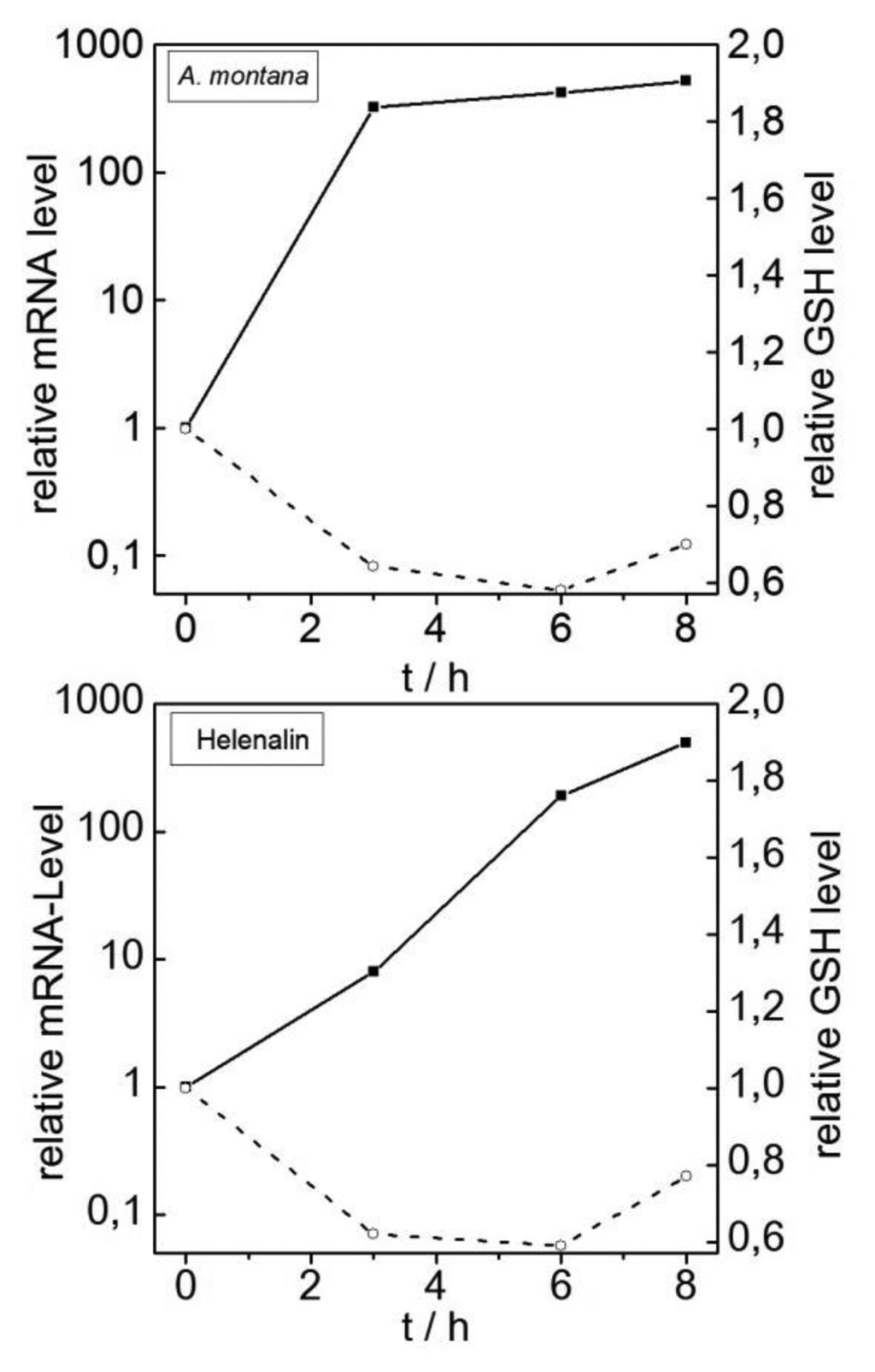 It is worth noting that although its effect on HSP70B' expression was similar to that which was observed following CdCl2 treatment, the tGSH concentrations of cells that were exposed to the A. montana extract did not increase but rather declined by more than half of the level of untreated controls (Figure 3). Likewise, helenalin dramatically reduced the tGSH pool in the HaCaT cells. Although the effects on the cellular tGSH concentrations that were obtained using the A. montana extract or helenalin seemed to conflict with the results that were observed following exposure to cadmium, other studies have described the reduction of the cellular tGSH pool by STL, including helenalin, likely through the ROS-dependent oxidization of the cysteine pool that is required for glutathione synthesis [23].