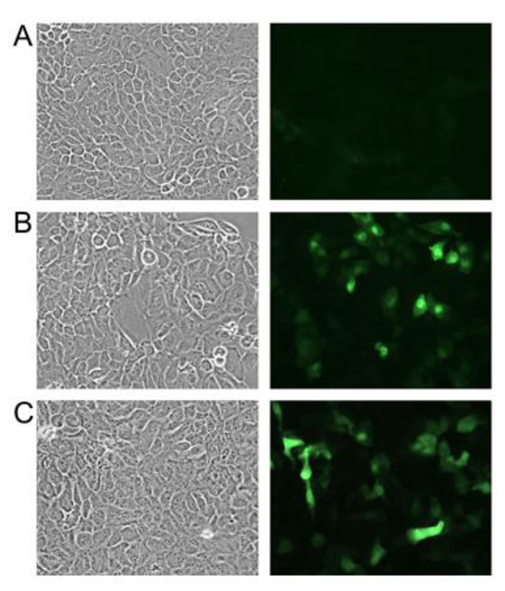 Fluorescence microscopy was used for the quantitative assessment of cellular GFP expression levels in an incubation time- and dose-dependent manner. The sensor cell line was seeded on coverslips at a density of 50,000 cells/cm2 in 24-well culture plates. Following treatment with toxins, the cells were kept under normal culture conditions for up to 18 h. GFP expression levels were observed using an Axio Imager M2 (Zeiss, Jena, Germany). Cell culture images showing confluent cell layers were digitally recorded with an AxioCam MRm camera that was attached to the microscope using the filter set 38 HE and a 20× objective (Zeiss, Jena, Germany). The average fluorescence (mean grey value) of each cell region was corrected for medium and device fluorescence, and compared to an untreated control to obtain relative fluorescence values.