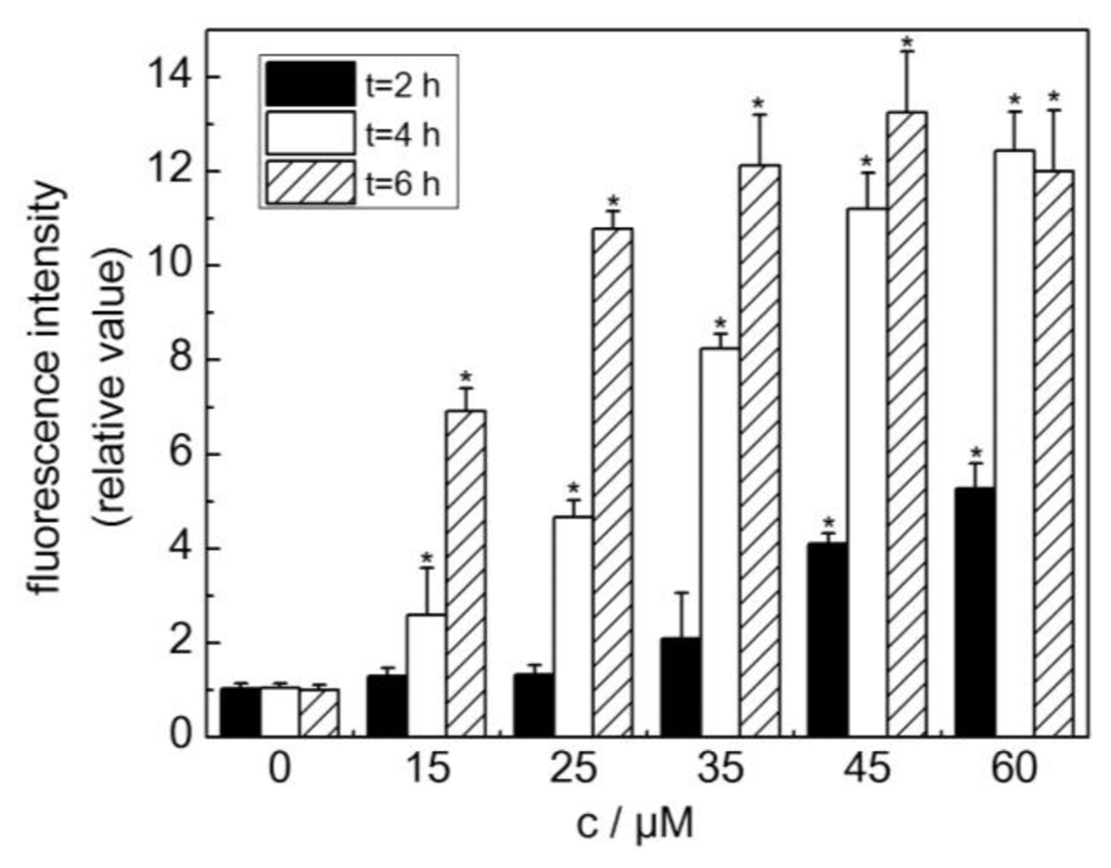 A quantitative read-out of the stress response that was elicited by the HSP70B'-GFP cells was desirable for the facilitation of the automated screening of the chemicals that were suspected to cause skin irritation. To this end, oxidative stress-induced GFP fluorescence was determined using quantitative fluorescence microscopy. As presented in Figure 5, the exposure of the sensor cells to increasing CdCl2 concentrations induced a concentration- and time-dependent increase in GFP fluorescence that reached a plateau at approximately 12-fold levels of induction compared with the untreated sensor cells. The exposure of the sensor cells to over 60 μM CdCl2 resulted in aberrant cell morphology and eventually decreased GFP fluorescence (data not shown). Fluorescence intensities were recorded for different CdCl2 concentrations after 6 h of incubation to determine the lowest detectable concentration. The LOD was defined as the concentration that induced a fluorescence intensity that was equal to or higher than the mean fluorescence of the untreated control cells plus three times the standard error of the measurement according to the three-sigma rule (data not shown). Based on this definition, the sensor cells displayed an LOD of 6 μM CdCl2 for a 6 h exposure time, which is comparable to the LOD of the applied conventional tGSH assay.