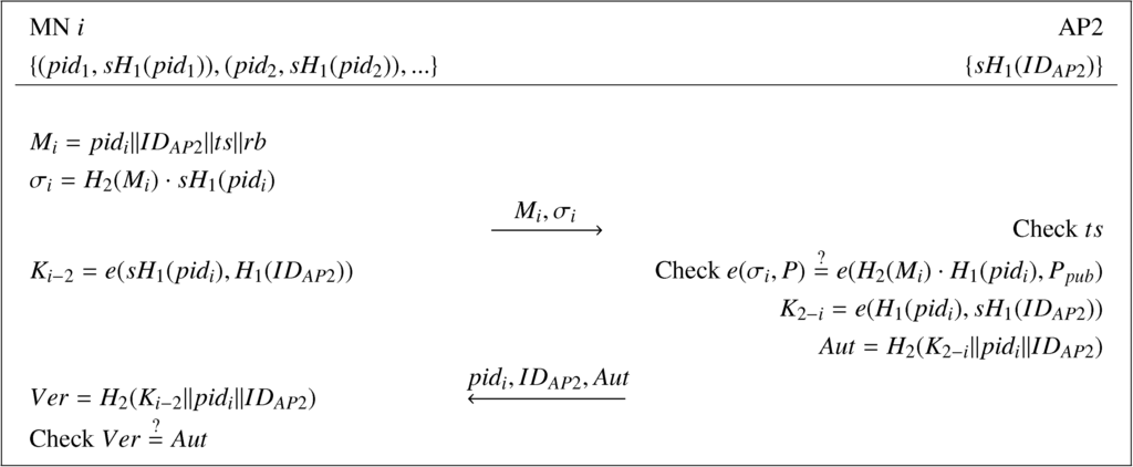 (2) Upon receiving the message {Mi, ri, σi}, AP2 checks the timestamp ts. If invalid, the request is rejected. Otherwise, AP2 verifies if e(σi, P)=e(H2(Mi‖Ri)H1(pidi) + Ri, Ppub). If true, AP2 computes the session key K2−i = e(H1(pidi), sH1(IDAP2)) and the authentication code Aut = H2(K2−i‖pidi‖IDAP2) and, then, sends the tuple {pidi, IDAP2, Aut} to MN i.