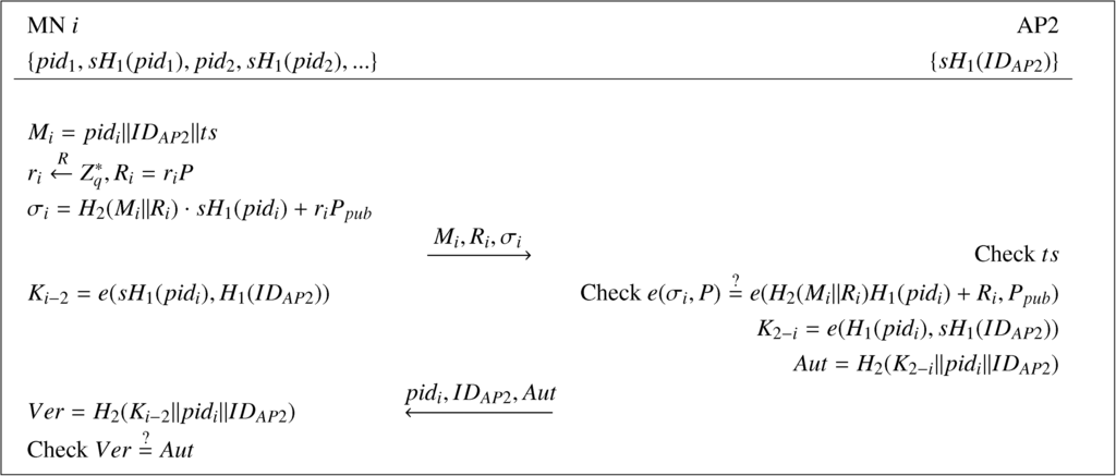 (1) MN i firstly picks an unused pseudo-ID pidi and the corresponding private key sH1(pidi) and computes Mi = (pidi‖IDAP2‖ts), where ts is the timestamp. Then, MN i chooses a random value , which is a nonce, computes Ri = riP and σi = H2(Mi‖Ri) · sH1(pidi) + riPpub and unicasts the access request message Mi and its signature pair (Ri, σi) to AP2. Finally, it computes the session key with AP2 as Ki−2 = e(sH1(pidi), H1(IDAP2)).