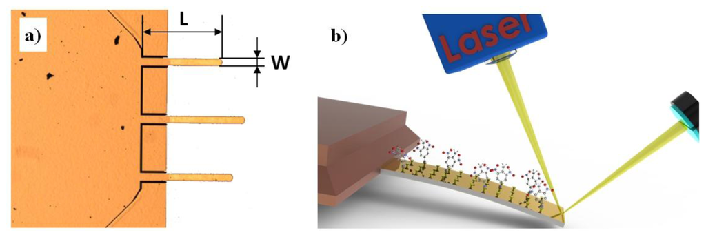 For this purpose, commercially available, micro fabricated silicon cantilevers, which are typically 100–350 μm long, 20–25 μm wide, and 0.5–1 μm thick (Figure 1a) and with force constants ranging from 0.03 to 1.75 N/m, are functionalized on one of the two sides with a thin molecular layer that shows an affinity to the target molecules present in the environment. The surface coverage of the functionalized surface by target molecules is increased in the continuous process of surface adsorption and desorption, and generates either compressive or tensile surface stress which eventually results in a bending of the cantilever. This small bending can be measured either optically or electrically. In optical detection, a focused laser beam is reflected from the cantilever and the cantilever bending causes a deflection of the reflected beam [12]. This deflection is measured very precisely using a quadrant photodiode detection scheme (Figure 1b), a principle invented for the Atomic Force Microscope (AFM) microscope [11]. Another possibility is to measure a change in the resonant frequency of the cantilever due to the mass loading [13,14].