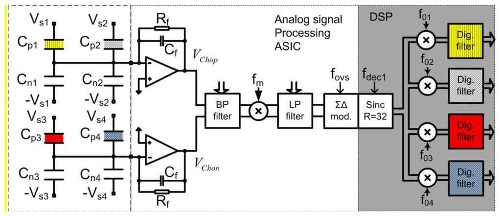 Excitation sensor signals are generated in the Field Programmable Gate Array (FPGA) and transferred to the Application Specific Integrated Circuit (ASIC), where further shaping and amplification takes place. The amplitudes and the DC levels of each excitation signal can be adjusted. They are connected to the corresponding sensor's capacitors and provide the possibility of transferring the information from slowly varying sensor capacitances to the trans-impedance charge amplifier at a high frequency, well above the flicker noise corner frequency. The whole measurement system looks like a modified lock-in amplifier [26,27], using double-mixing architecture to sense and amplify at high frequency above the 1/f noise corner of the CMOS charge amplifier. Each spectral component is not immediately reduced to the DC because, in that case, the 1/f noise and the offset voltage of the ADC would influence the results. The amplitudes, DC levels, and frequencies of excitation signals are programmable, and we can adapt each excitation generator to a particular sensor. At the moment up to four differential sensors are connected to one measurement channel according to Figure 12. Each sensor is driven with a square-wave excitation signal with slightly different frequency fsx, where all the signals are coherent [28]. One measurement channel can process the signals of four differential sensors. The “DC” signal-processing happens only in the DSP, and thus all DC drifts and 1/f noise problems of the analogue electronic modules are removed. As a result, the noise properties are improved.